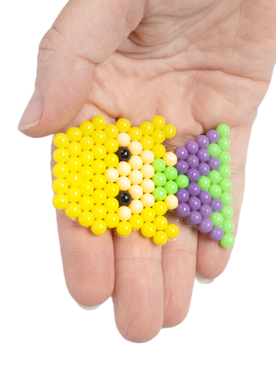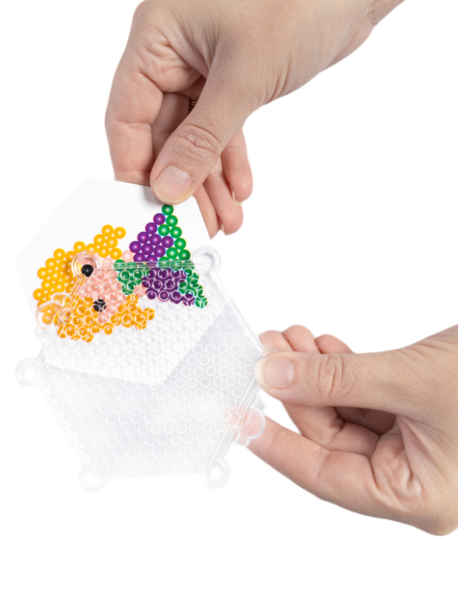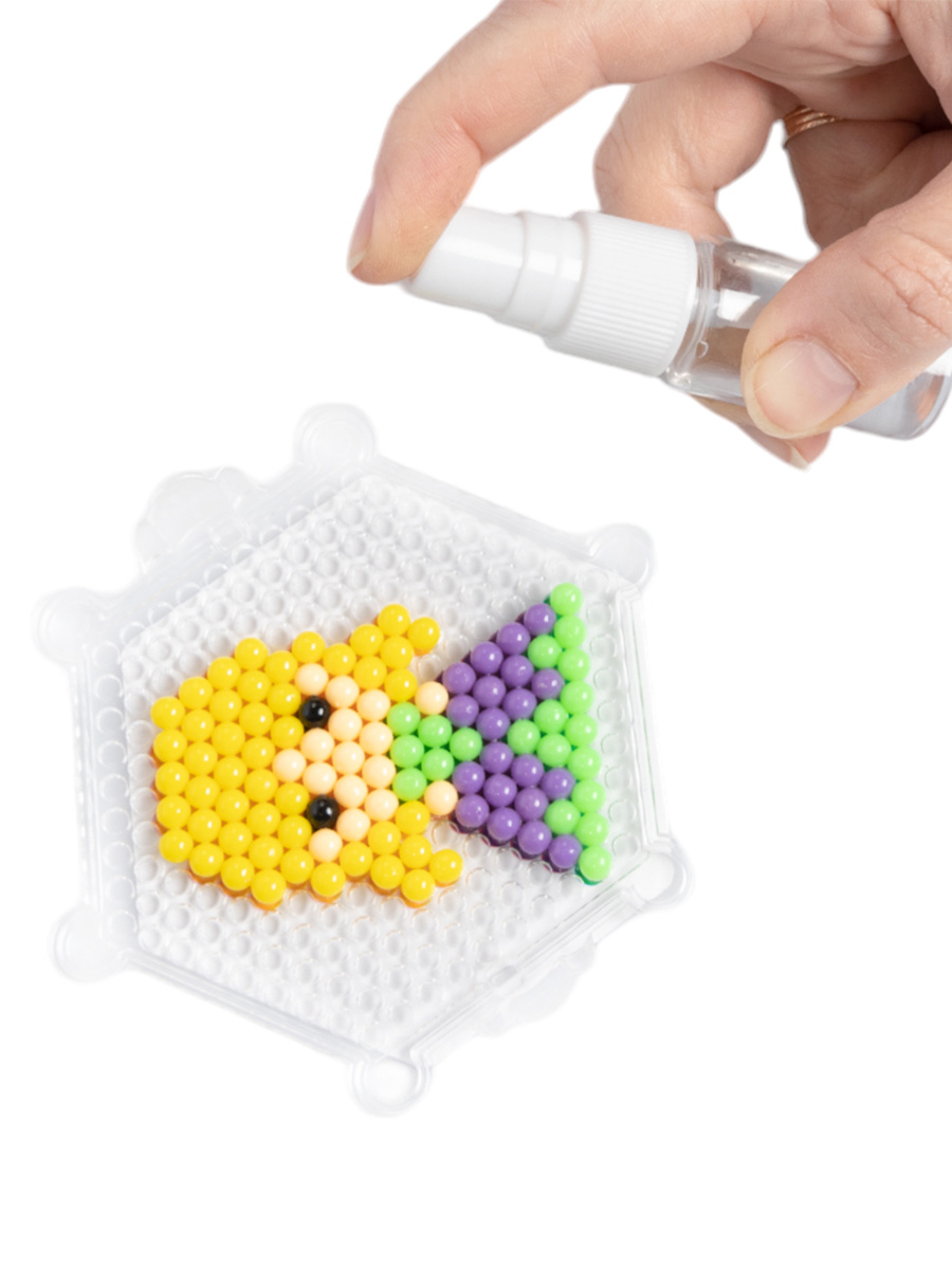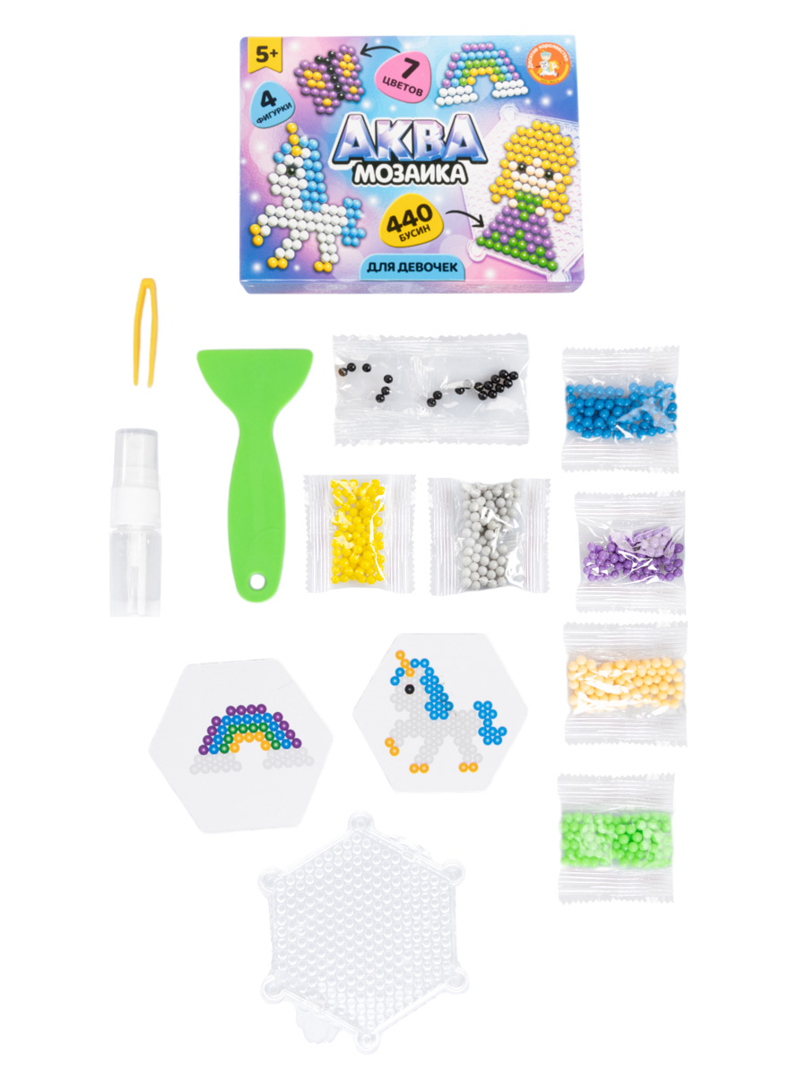 - цветные бусины (7 цветов, диаметр - 5 мм) - 440 шт. - картинки для составления мозаики - 4 шт. - планшет для сборки мозаики (8х8 см) - 1 шт. - пинцет (5,5 см) - 1 шт. - распылитель (флакон) - 1 шт. - скребок - 1 шт.