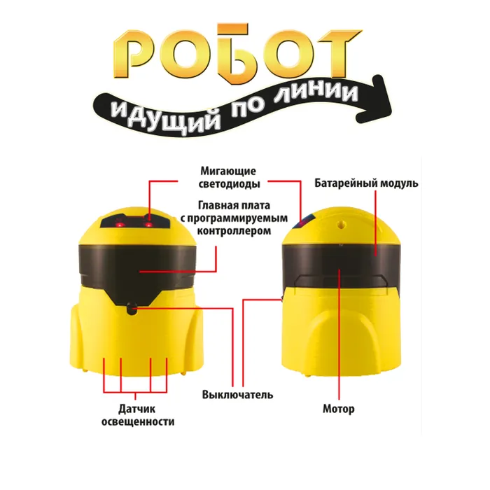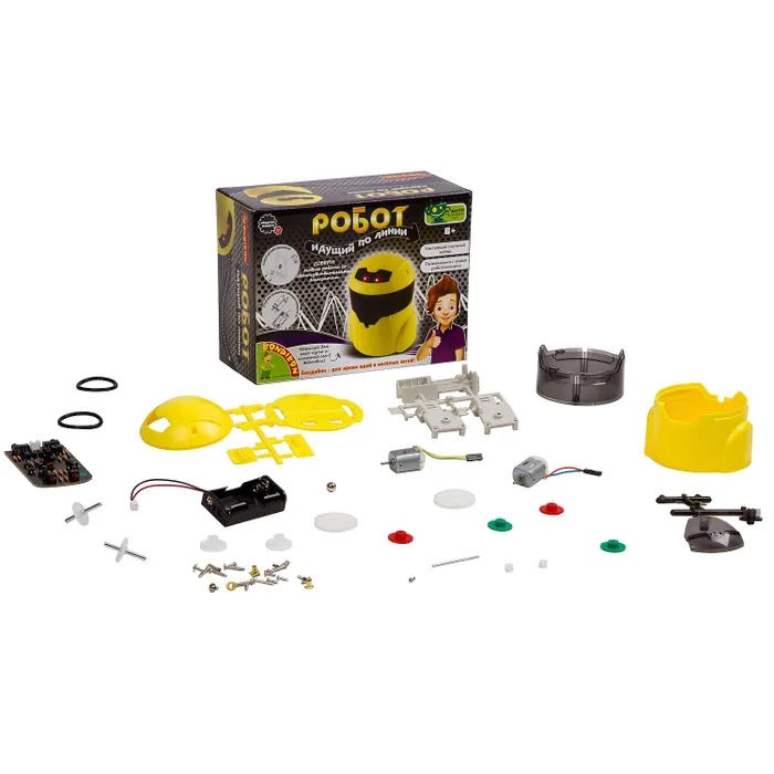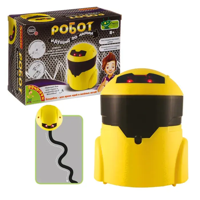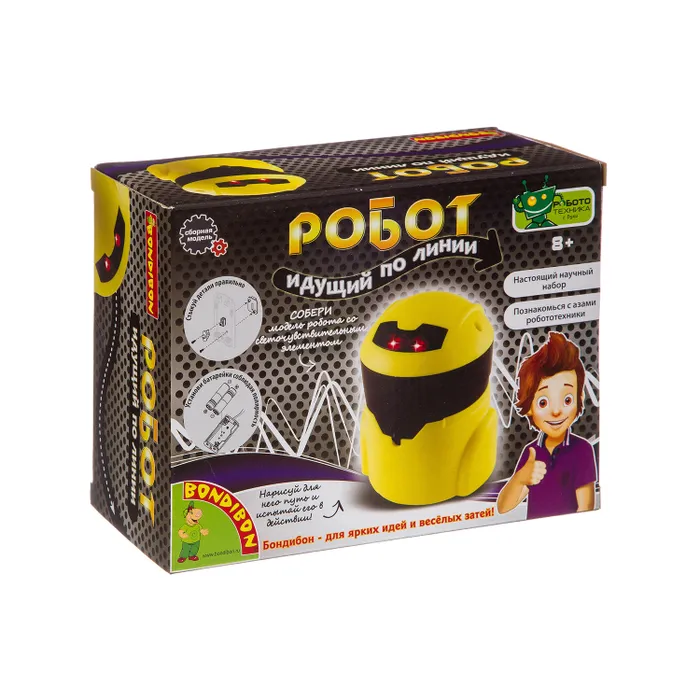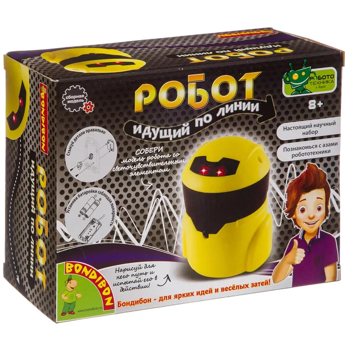 Набор для опытов робот, идущий ПО линии серии Французские опыты науки с Буки от Bondibon вызовет восторг у юных исследователей! Самостоятельно сконструируйте умную игрушку, нарисуйте путь и испытайте ее в действии! Следуя подробной инструкции, соберите забавного желтого робота. Прокладывайте маршруты с помощью черной изоленты или маркера. Наблюдайте, как робот послушно движется по нарисованной линии и сверкает глазами (светодиодами). Набор для экспериментов познакомит ребенка с азами робототехники, принципами действия главной платы с программируемым контроллером, сверхчувствительных элементов, датчика освещенности, мотора, разовьет интерес к физике, электронике, конструированию, моделированию, а также мелкую моторику, логическое мышление, внимание, эмоциональный интеллект.