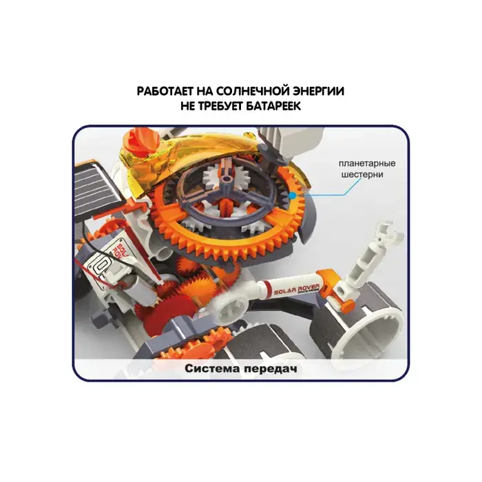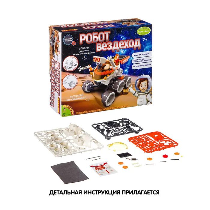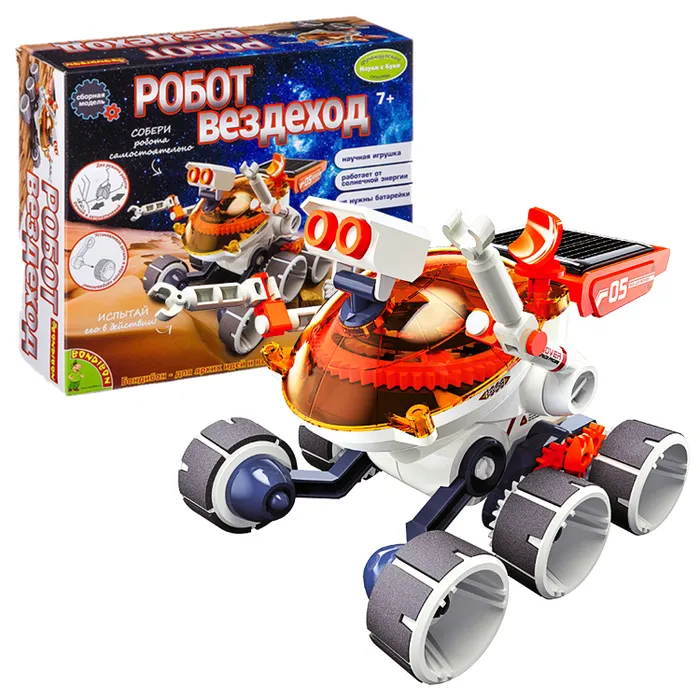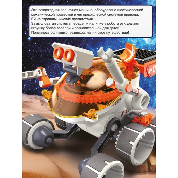 Солнечный вездеход осваивает новые галактики и готов преодолеть любое препятствие, проходя даже сложные местности нашей планеты. Шестиколесная механическая подвеска, четырехколесная система, регулируемая солнечная панель, радар. Испытай его в действии! Собери механического дроида с помощью инструкции, входящей в каждый набор для опытов Bondibon. С цветными пошаговыми картинками ты сможешь это сделать самостоятельно и узнать секрет солнечных батарей, приводящих робота в движение. Серия Французский опыты Науки с Буки мотивирует ребенка на успешное самостоятельное обучение, подарит новые открытия, исследования и расширение кругозора. Маленький изобретатель познаёт азы теоретической механики, электроники, инженерии. У детей развивается логическое мышление, концентрация внимания, зрительное восприятие. Робот вездеход выполнен с гарантией качества Бондибон. Все детали приятно держать в руках, модули не портятся, поэтому к игре можно возвращаться много раз.