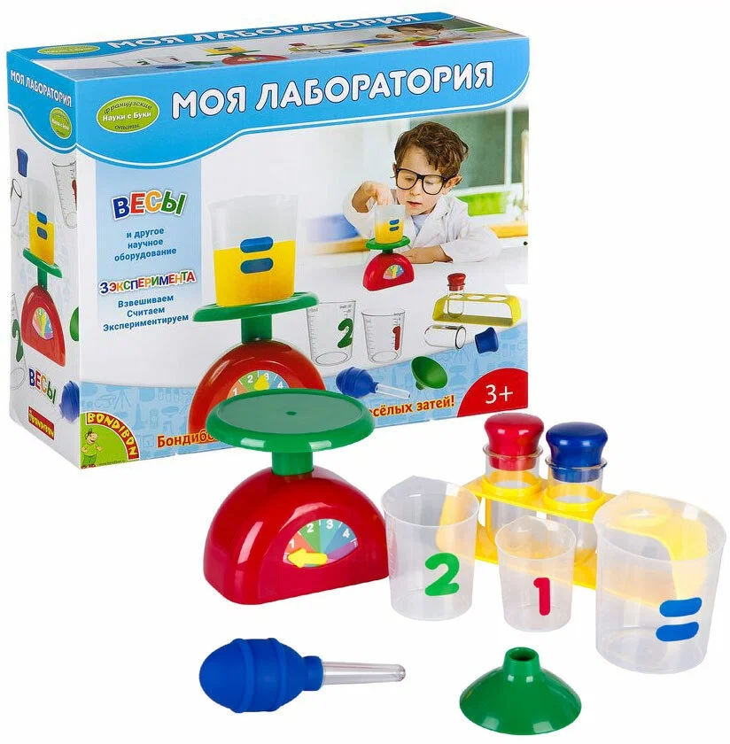 Моя лаборатория - это увлекательный научный набор. С ним ребёнок может проводить опыты по физике, взвешивать, проводить эксперименты с весами и весом разных и одинаковых предметов.