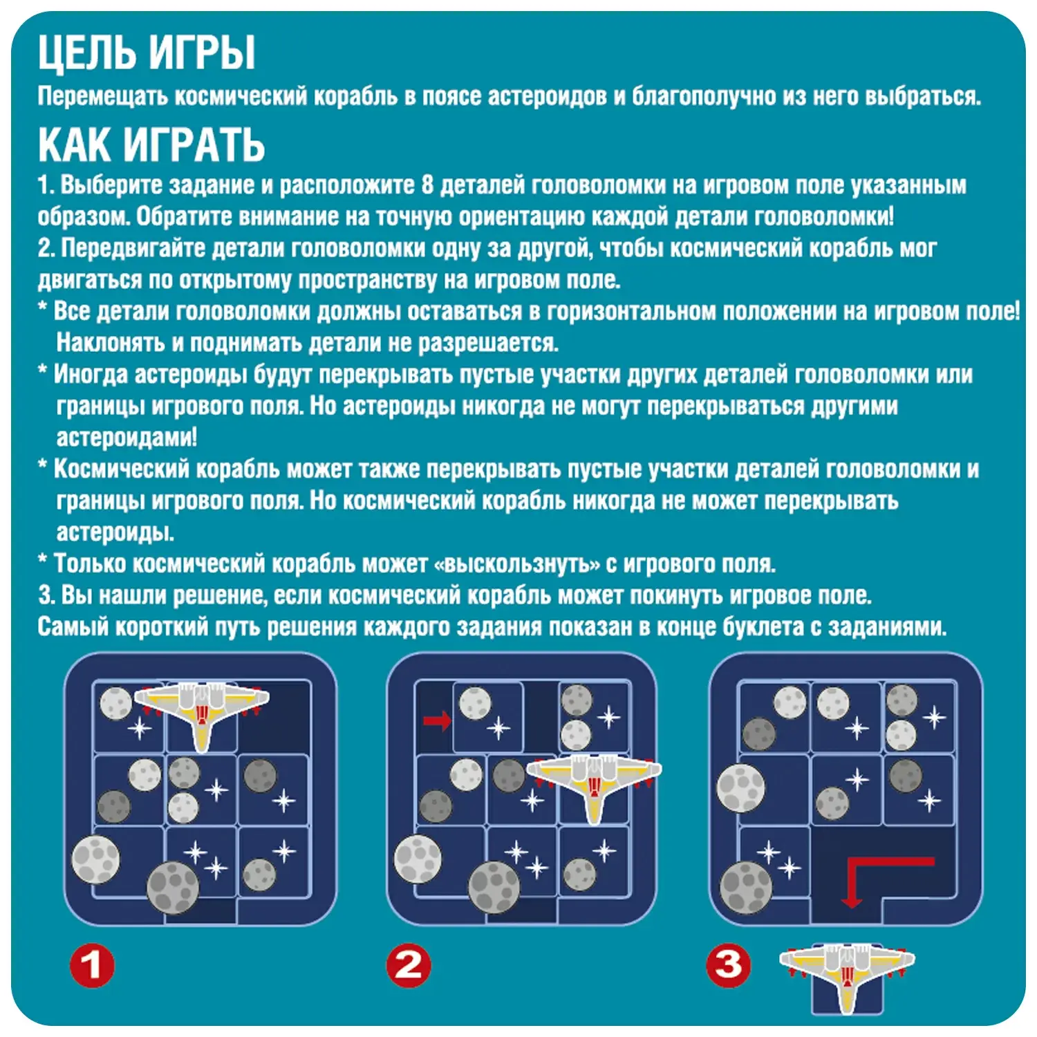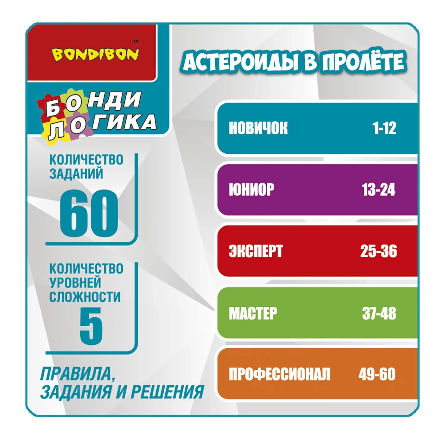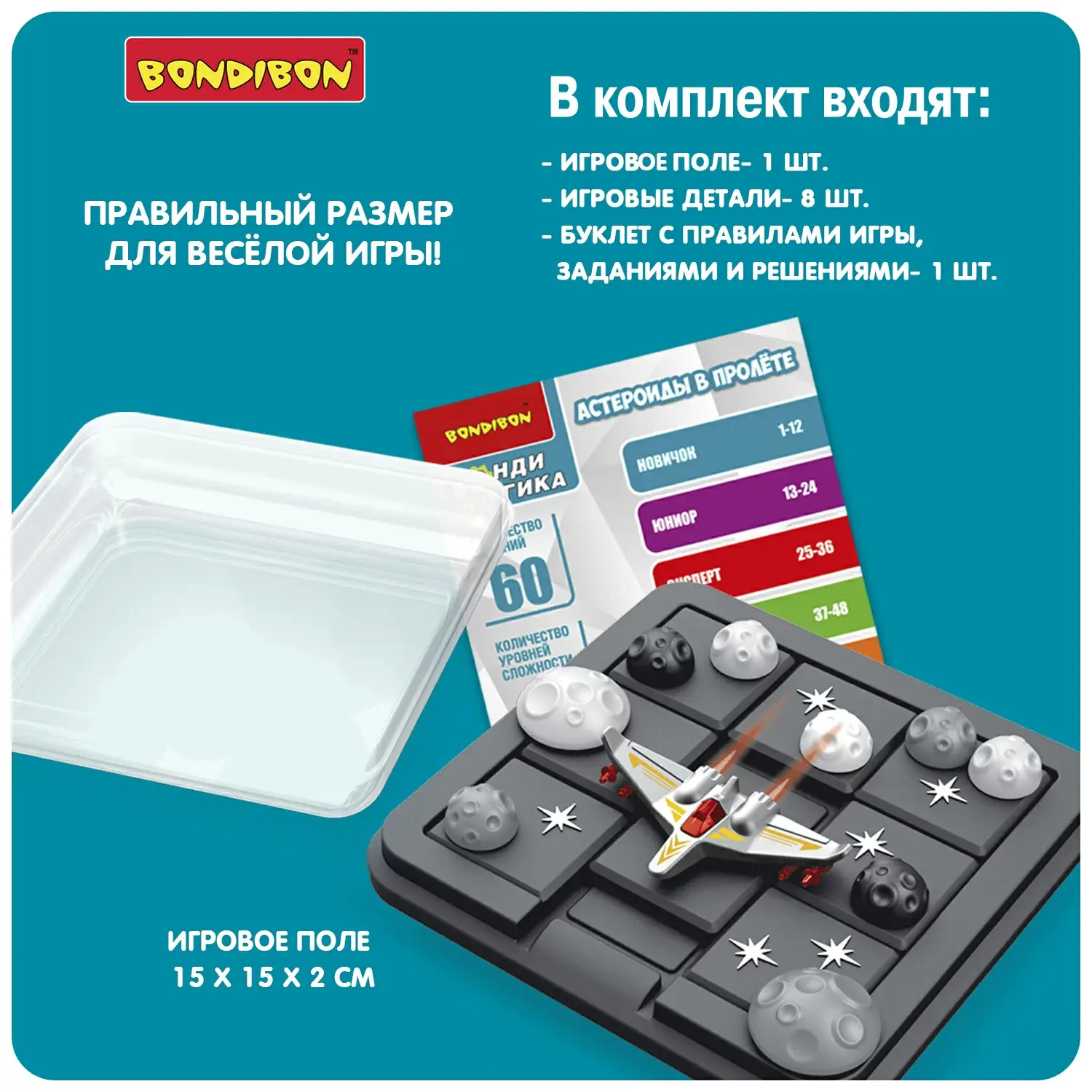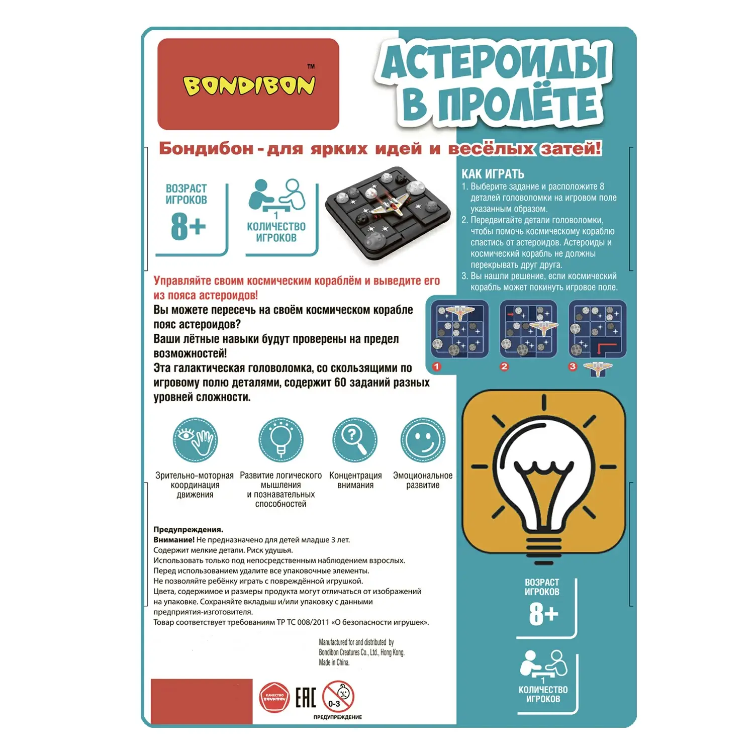 Настольная логическая игра АСТЕРОИДЫ В ПОЛЕТЕ от Bondibon заинтересует не только детей, но и взрослых. Развивайте логику с захватывающей галактической головоломкой серии БондиЛогика! Выберите одно из 60 заданий. Расположите 8 частей головоломки указанным образом на игровом поле. Помогите космическому кораблю спастись от астероидов, передвигая детали. Астероиды и космический корабль не должны перекрывать друг друга. Если космический корабль может покинуть игровое поле - Вы нашли верное решение! Постепенно переходите на более сложные уровни. Увлекательная игра от Бондибон доставит детям огромное удовольствие и поможет развить координацию движений, познавательные способности, внимание и эмоциональный интеллект. А еще такой интеллектуальный подарок порадует бабушку и дедушку, ведь тренировать мозг полезно в любом возрасте!