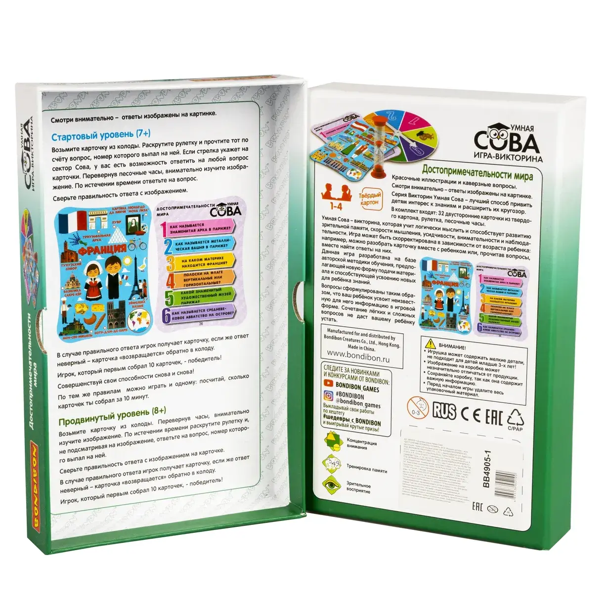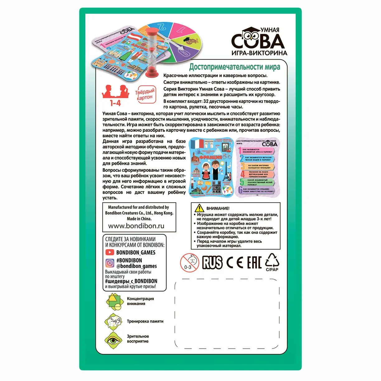 «Умная Сова» - викторина, которая учит логически мыслить и способствует развитию зрительной памяти, скорости мышления, усидчивости, внимательности и наблюдательности. Данная игра разработана на базе авторской методики обучения, предполагающей новую форму подачи материала и способствующей усвоению важных для ребёнка знаний в игровой форме. Ваш ребенок будет не бояться, а любить математику и поймет, что эта «сложная наука» на самом деле интересная, занимательная, удивительная и красивая! Правила игры содержат три уровня сложности и обеспечивают индивидуальный темп, объём и сложность игры в зависимости от возраста и возможностей игроков. Карточки можно также использовать в качестве своеобразного методического пособия, поскольку в них содержится следующая информация: обозначение и последовательность чисел от 1 до 10; арифметические действия; сравнение чисел - больше, меньше, столько же; представления о времени