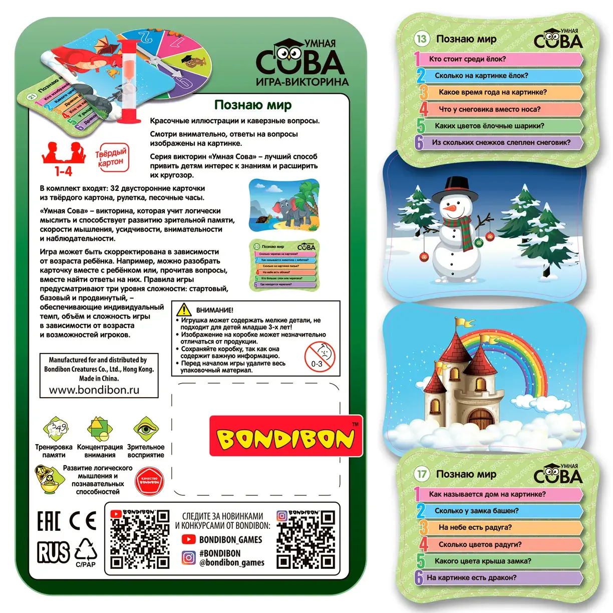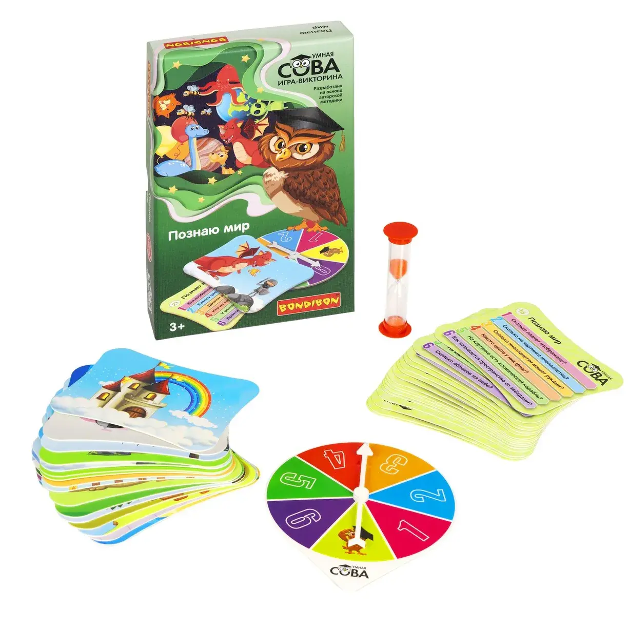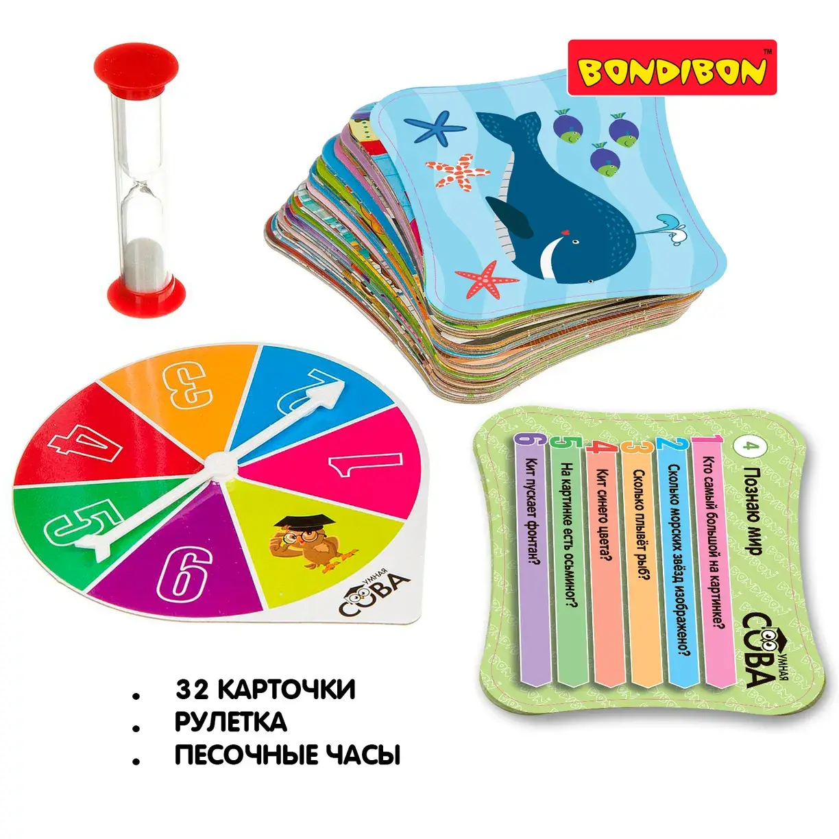 Игра викторина Познаю мир из серии Умная Сова от Bondibon — это уникальный развивающий игровой набор, способствующий познавательному развитию и расширению кругозора у детей. Развивашка отличный способ научить детей усваивать знания в игровой форме. Это не просто полезное развлечение, а настоящий тренажер для развития эрудиции и интеллекта ребенка. Вопросы охватывают большое количество тем и их проработка позволяет увеличивать словарный запас ребенка, улучшать навыки счета, цветовосприятия. Начать играть легко! Возьмите карточку из колоды. Раскрутите рулетку и прочтите тот по счету вопрос, номер которого выпал на ней. Если выпадает сектор Сова, то Вы можете выбрать любой вопрос. Переверните песочные часы и внимательно изучите изображение. По истечению времени отвечайте на вопрос и проверяйте правильность ответа!