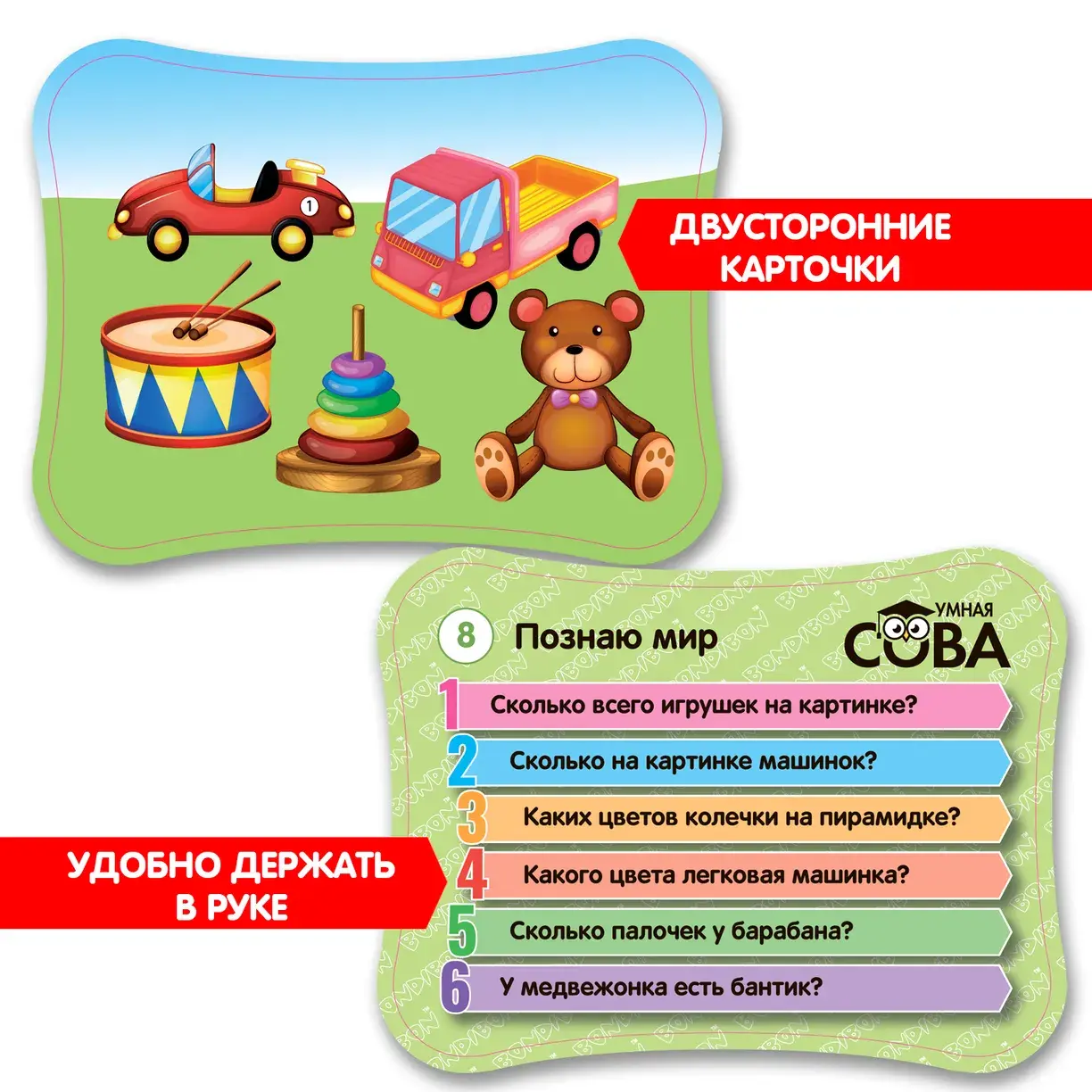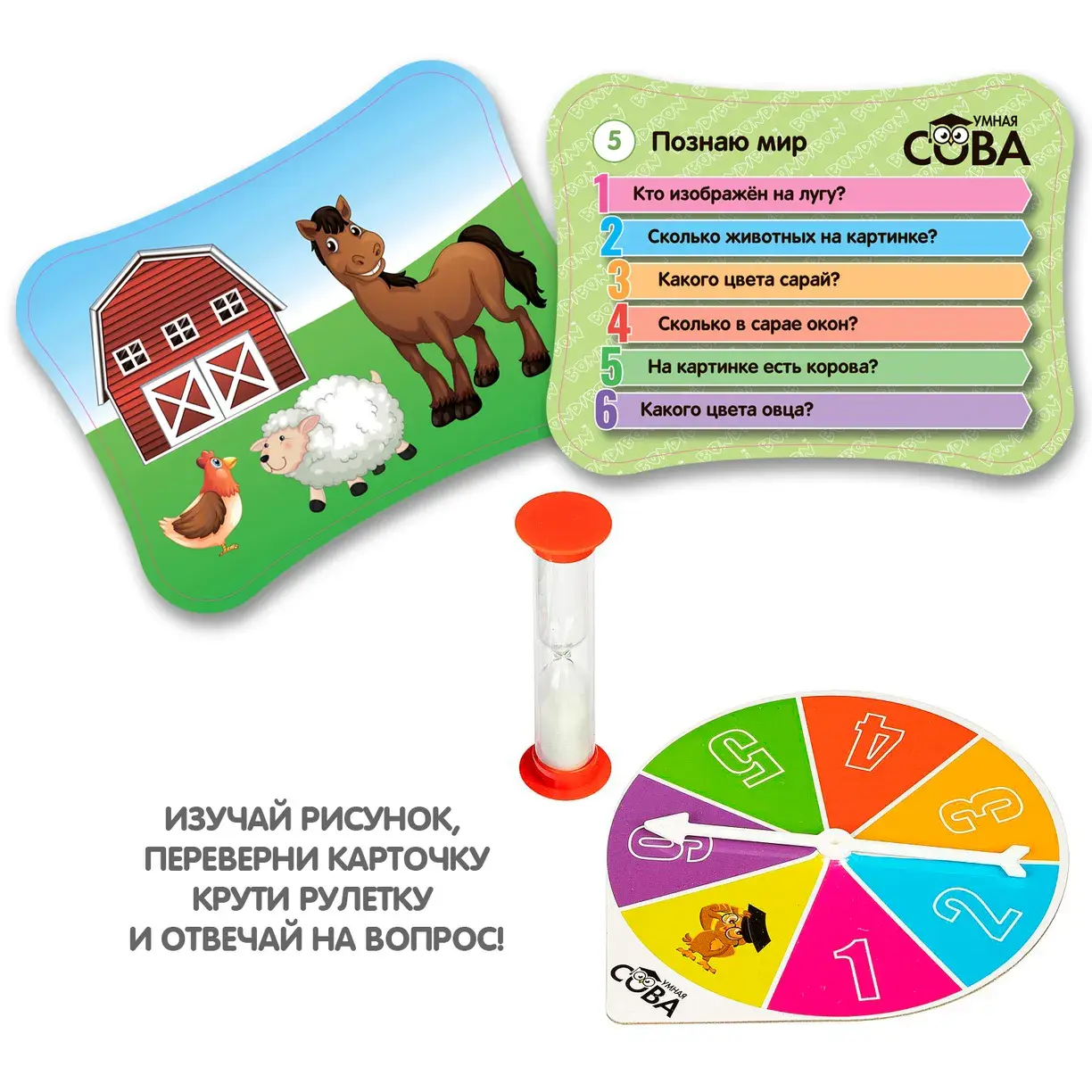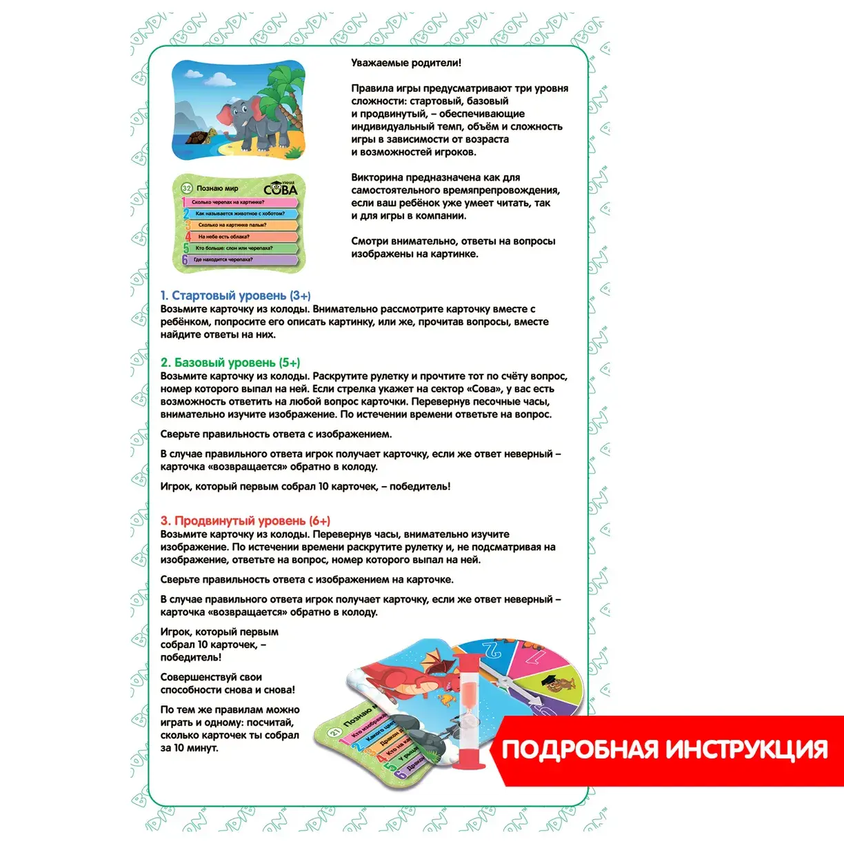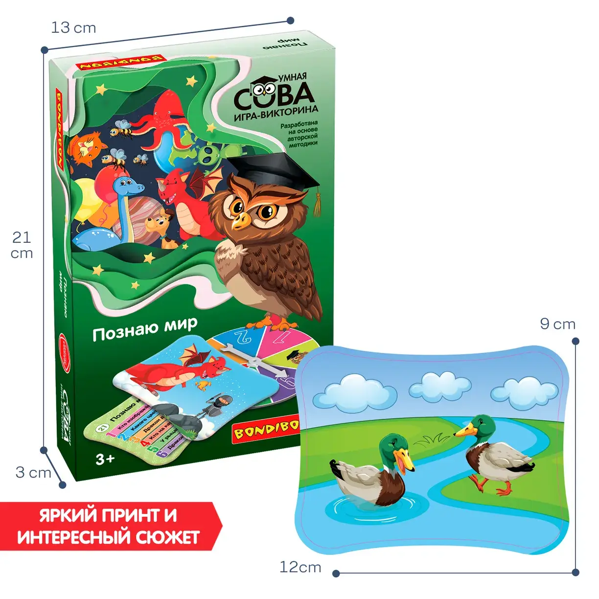 Игра викторина Познаю мир из серии Умная Сова от Bondibon — это уникальный развивающий игровой набор, способствующий познавательному развитию и расширению кругозора у детей. Развивашка отличный способ научить детей усваивать знания в игровой форме. Это не просто полезное развлечение, а настоящий тренажер для развития эрудиции и интеллекта ребенка. Вопросы охватывают большое количество тем и их проработка позволяет увеличивать словарный запас ребенка, улучшать навыки счета, цветовосприятия. Начать играть легко! Возьмите карточку из колоды. Раскрутите рулетку и прочтите тот по счету вопрос, номер которого выпал на ней. Если выпадает сектор Сова, то Вы можете выбрать любой вопрос. Переверните песочные часы и внимательно изучите изображение. По истечению времени отвечайте на вопрос и проверяйте правильность ответа!