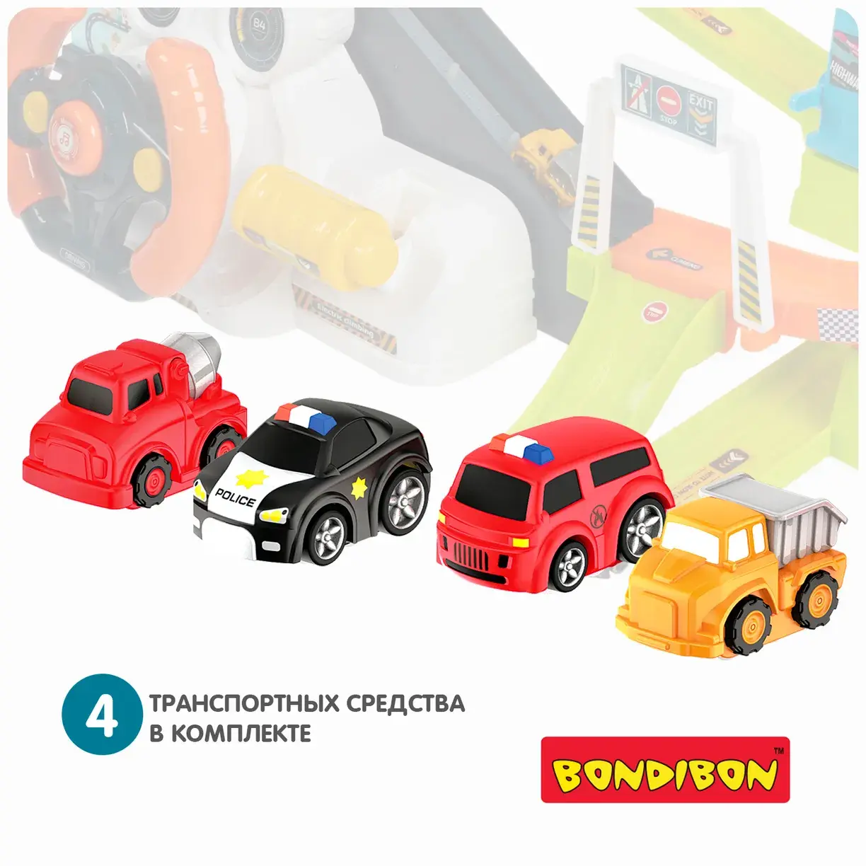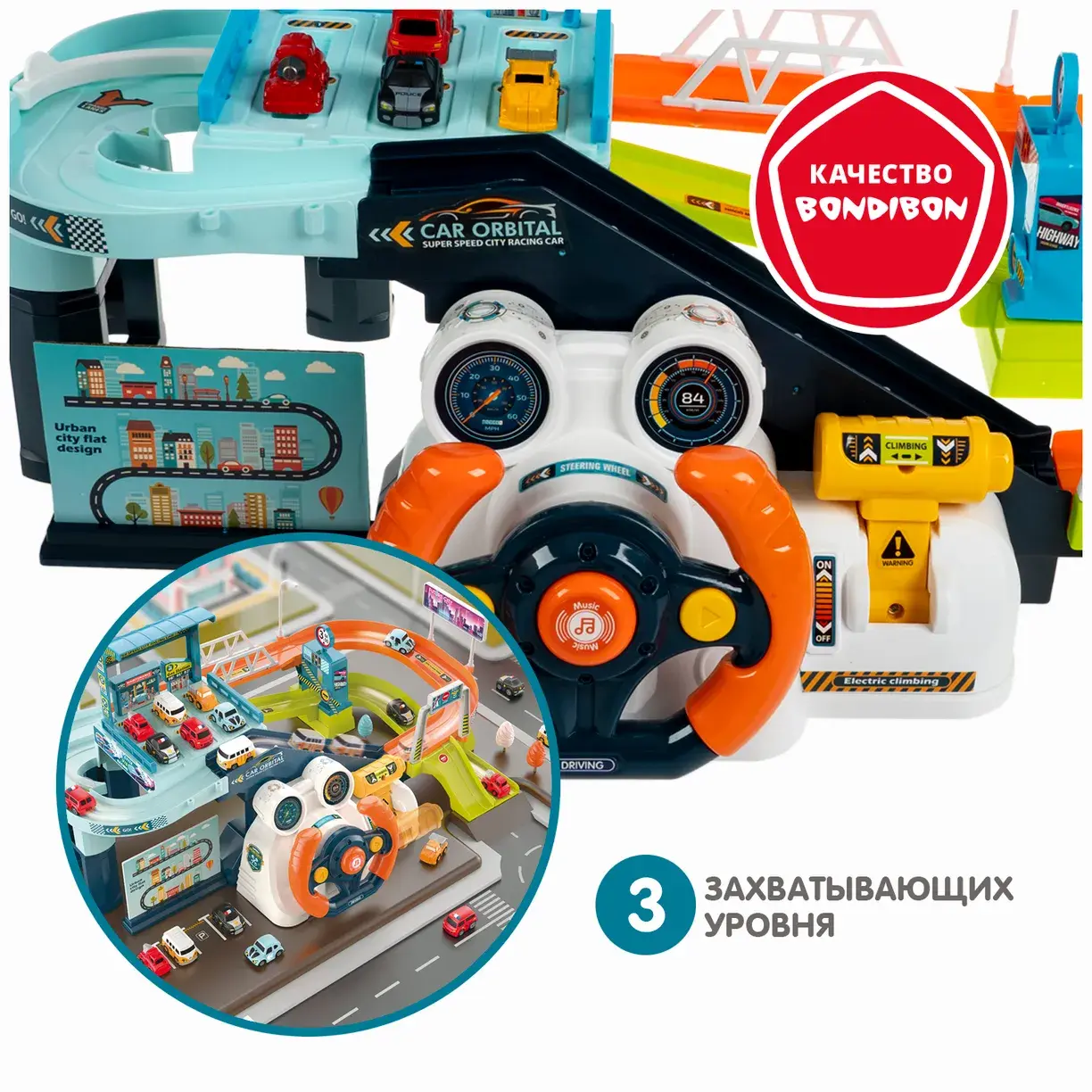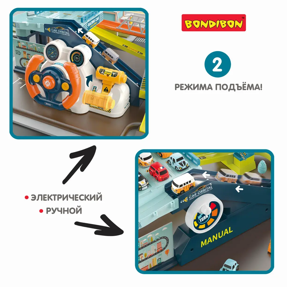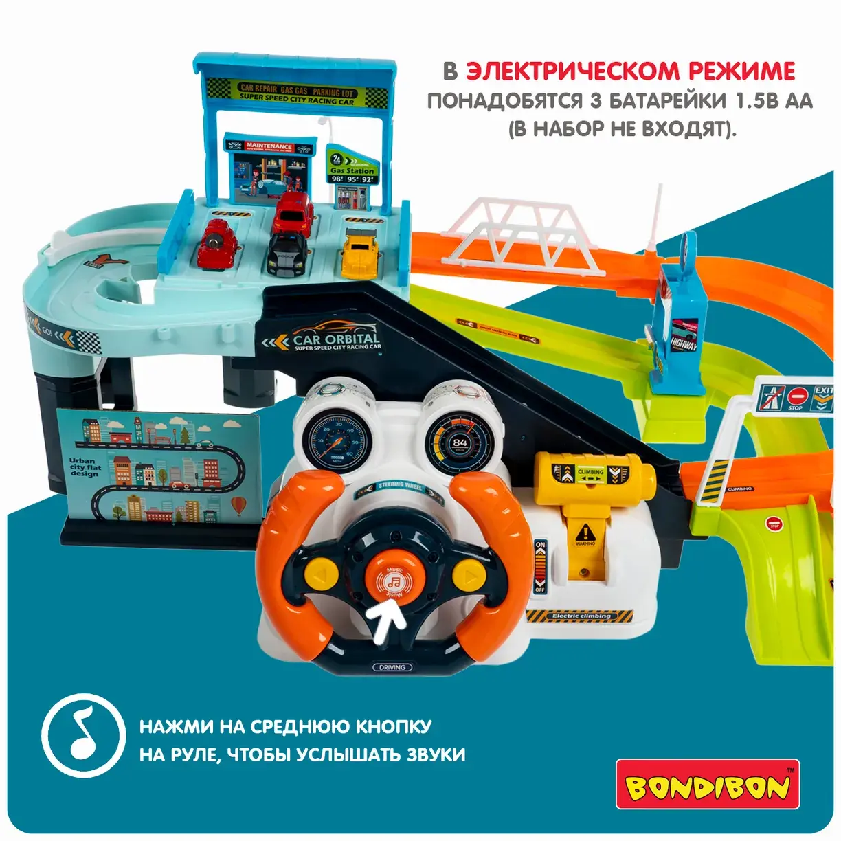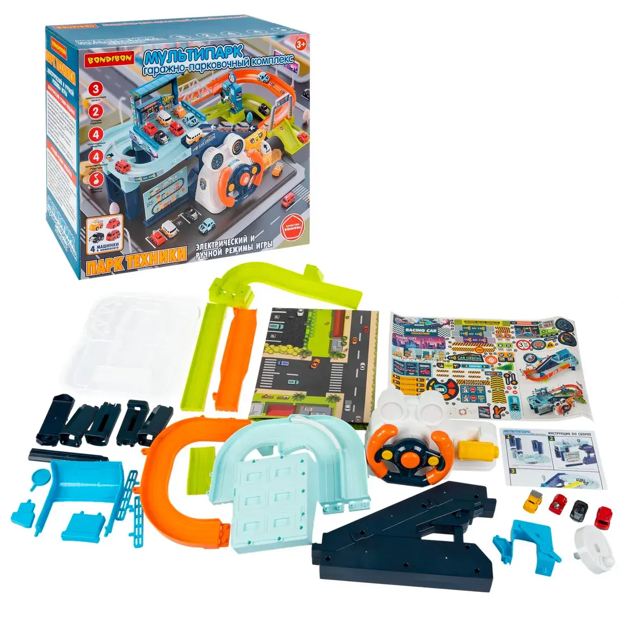 Соберите мультипарк и приклейте красочные стикеры. Установите комплект рулевого колеса или ручное устройство управления. В электрическом режиме Вы сможете наблюдать за движением машинки, имитировать вождение при помощи рулевого колеса и добавить звуковой эффект, нажимая среднюю кнопку на руле. В ручном режиме Вы сможете самостоятельно управлять движением и скоростью машины. Мультипарк на батарейках от Бондибон познакомит ребенка с разными приводами подъемника, разовьет координацию движений, познавательные способности, внимание и фантазию.