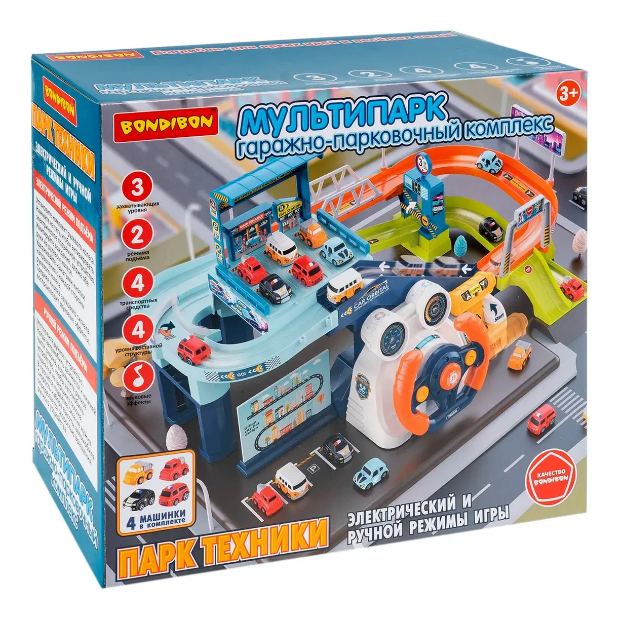 "МУЛЬТИПАРК серии Парк Техники от Bondibon со звуком и двумя режимами подъема – это впечатляющий игровой набор для детей! Ребенок сможет собрать многоуровневый гараж-парковку и играть с ним, запуская четыре яркие машинки!
