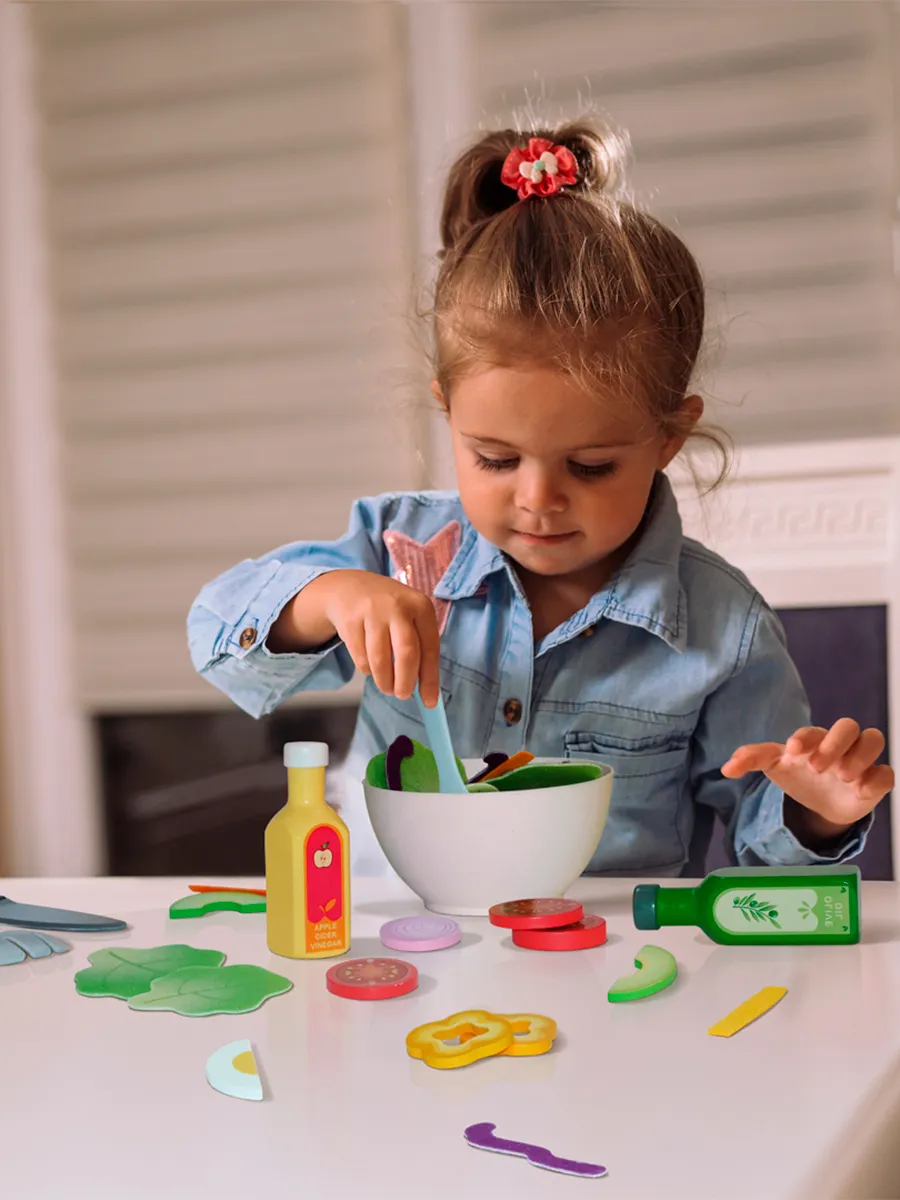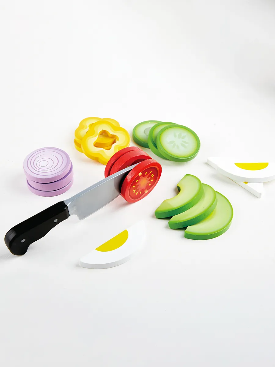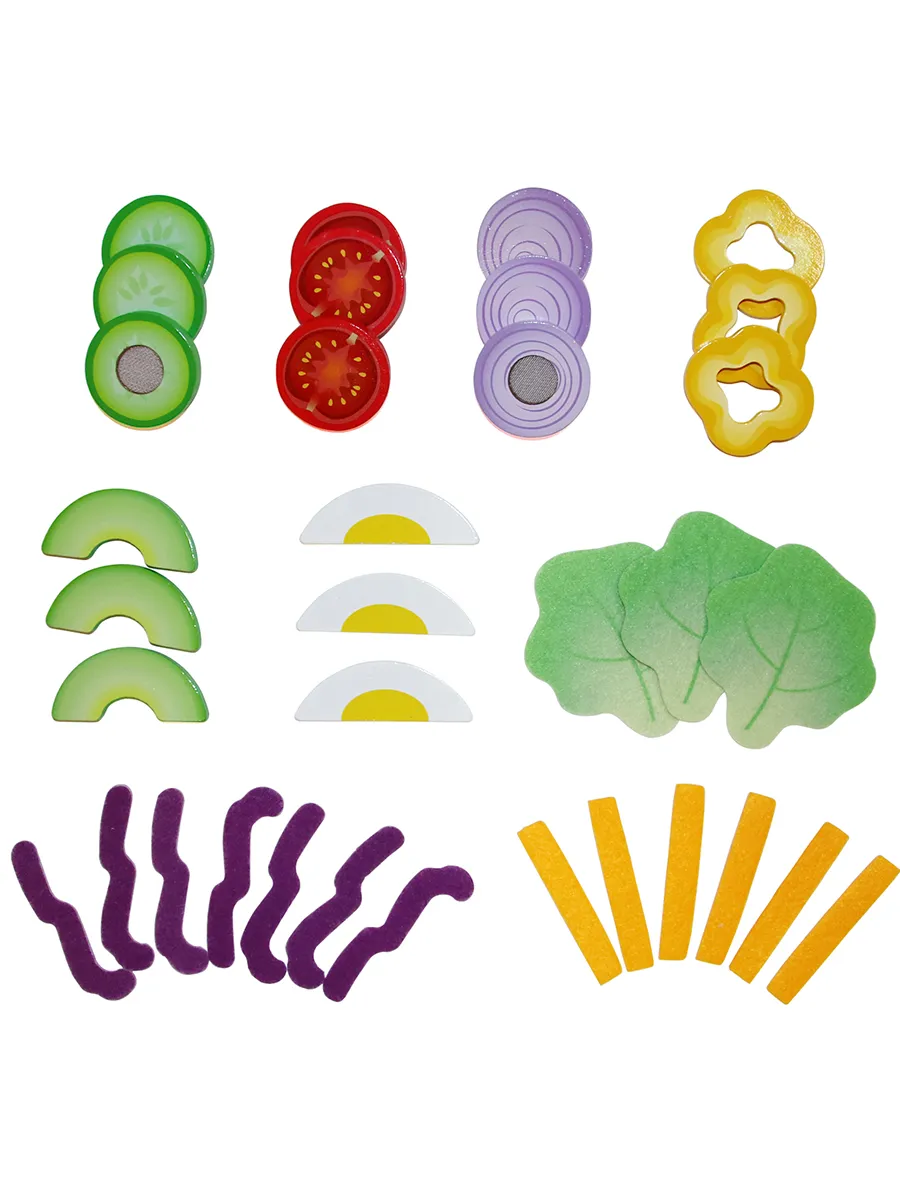 Этот восхитительный игровой набор помогает детям познакомиться с салатом и овощами и вдохновляет их на формирование привычек здорового питания. Он наполнен смесью красочных ингредиентов для салата, которые можно нарезать, чтобы юные повара могли притвориться, что играют! Поощряйте любознательность и дайте своим детям возможность развивать воображение, развивать свои языковые и социальные навыки, играя с этим реалистичным набором салатов самого высокого качества! Объедините этот набор с другими наборами еды, чтобы устроить веселый праздник. Этот набор игрушечных салатов добавляет реалистичности игре! Он отлично подходит для развития мелкой моторики и зрительно-моторной координации путем нарезки и сортировки ингредиентов, а также их смешивания. Самоклеящиеся выступы на овощах издают хруст при нарезке, а ингредиенты имеют закругленные края, удобные для маленьких пальчиков.