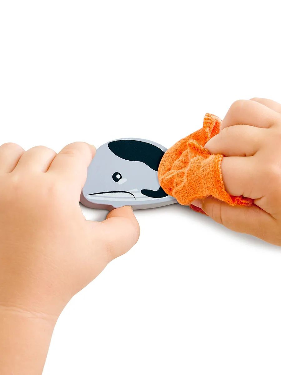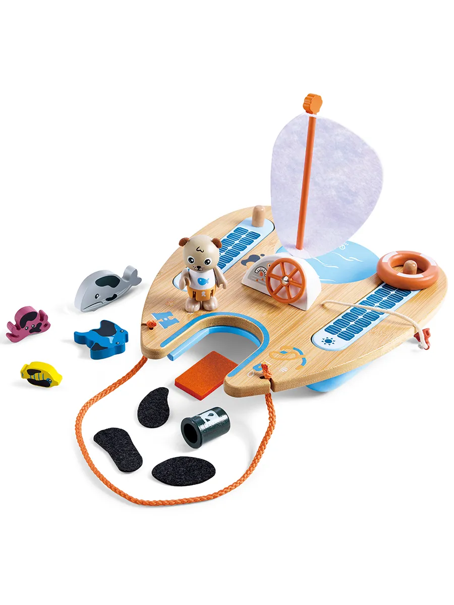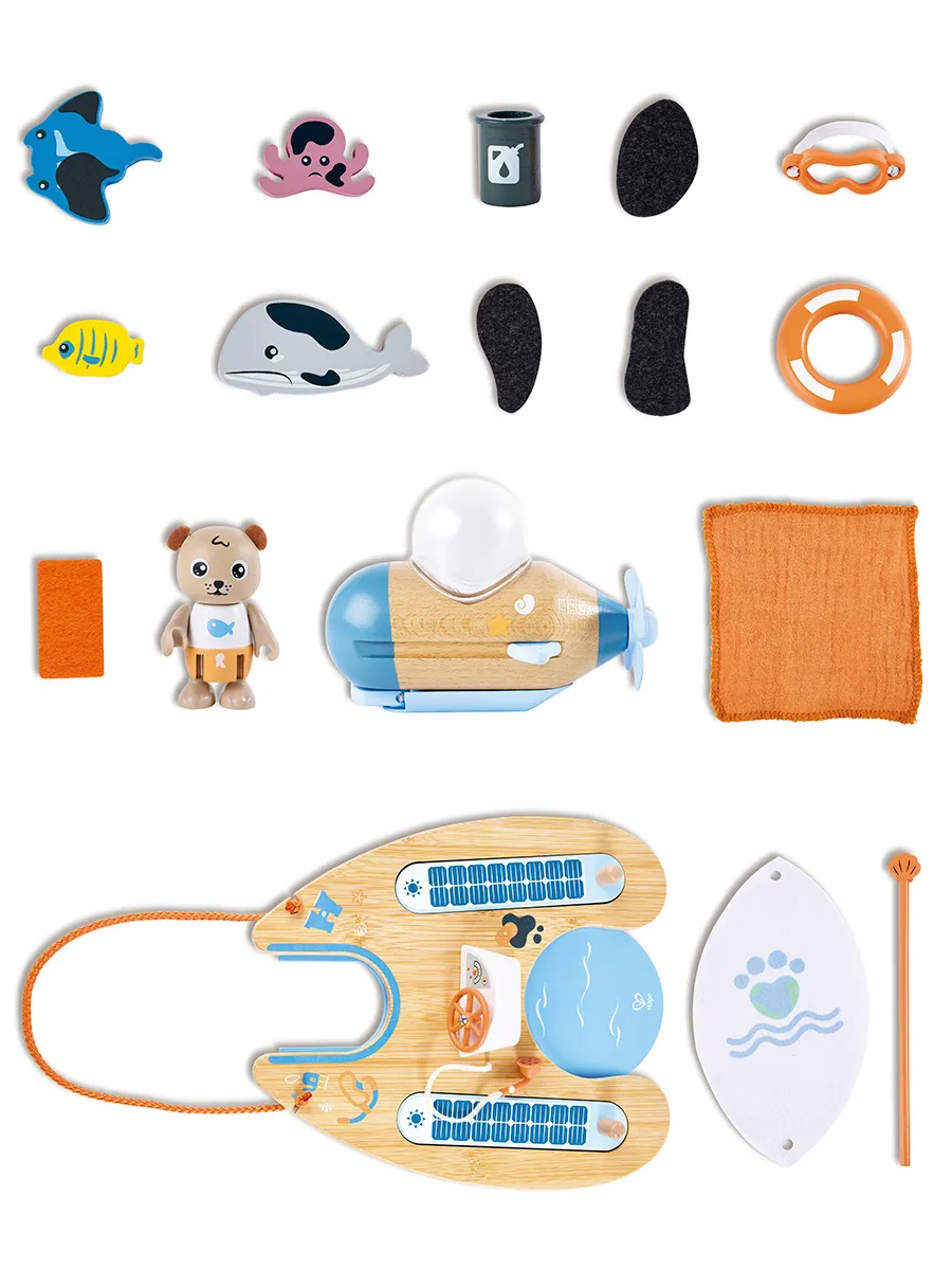 фигурка выдры, лодка, мачта, парус, очки для дайвинга, кит, осьминог, скат, рыба, масляные пятна (фетровые) - 3 шт., губка для впитывания масла, полотенце, бочка с маслом, спасательный круг - 2 шт., подводная лодка.