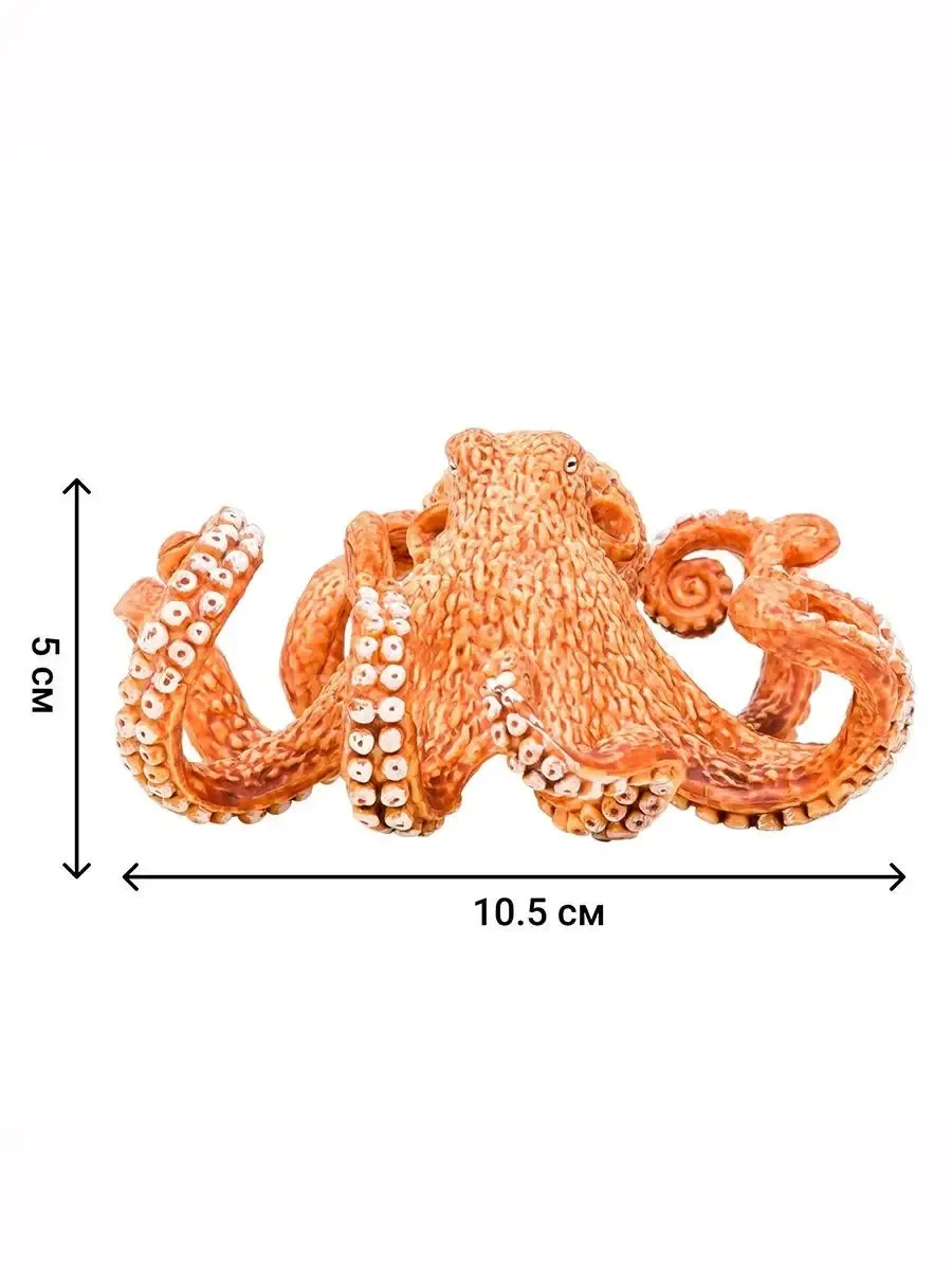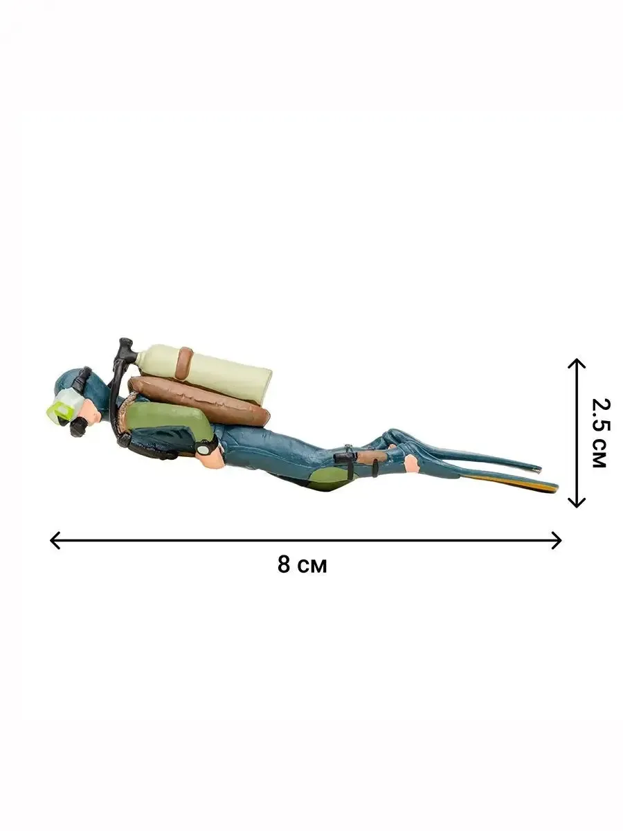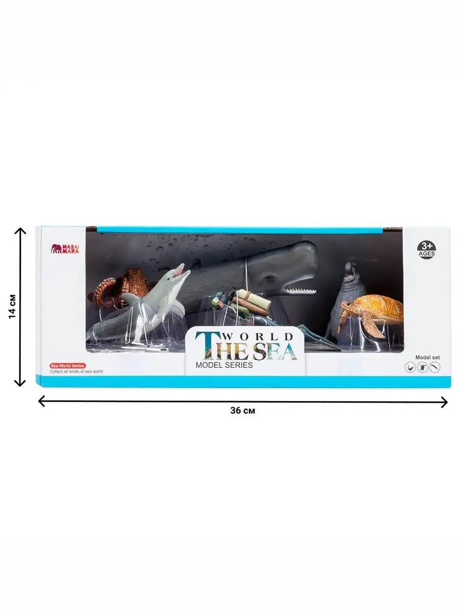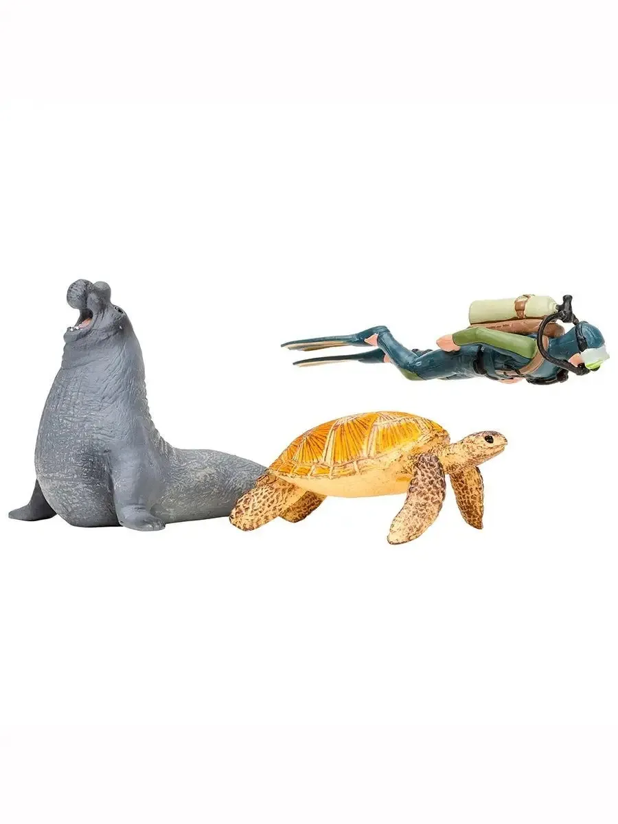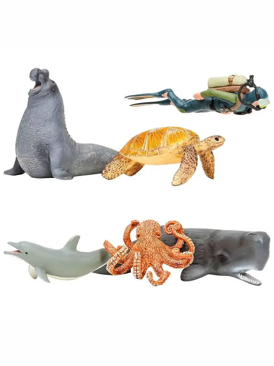 кашалот (23x7x5 см), морская черепаха (9,4x6,5x4 см), дельфин (12x5x4,5 см), осьминог (10,5x9,5x5 см), морской слон (11,5x8x8,5 см), дайвер (8х2,5х2,5 см)