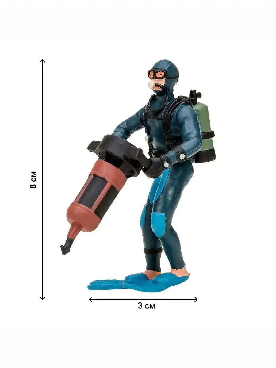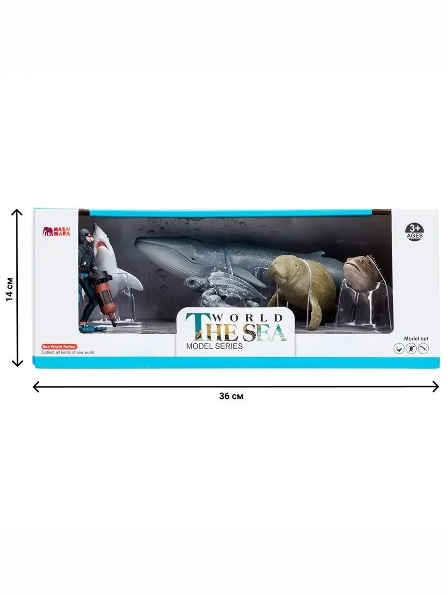 серый кит (28x9,5x4 см), ламантин (15,5x5,5x6 см), акула (12,5x6x6,5 см), кожистая черепаха (8х7,5х3 см), рыба групер (11x4x4,5 см), дайвер (8х3х3 см)