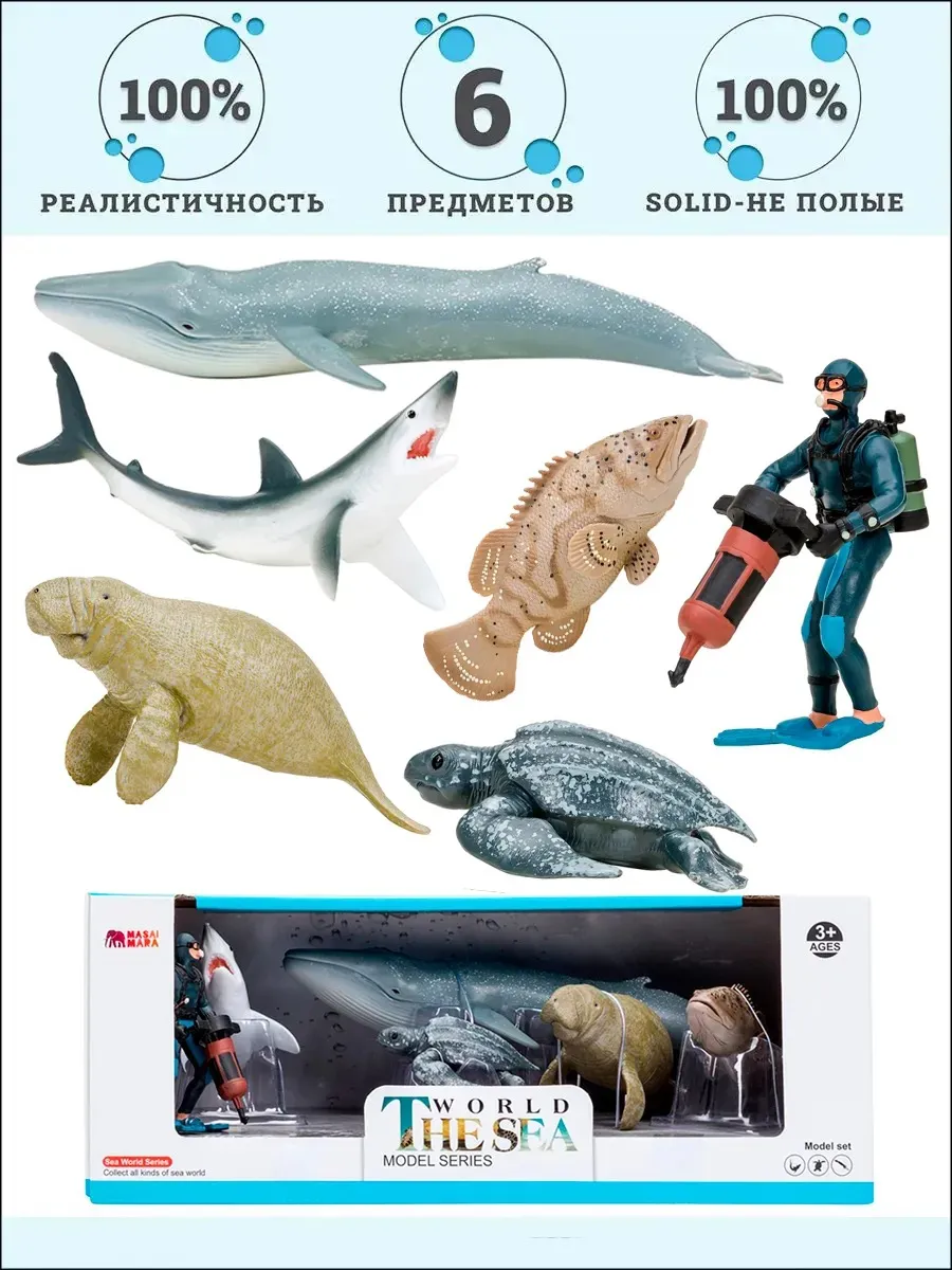 Фигурки серого кита, ламантина, акулы, кожистой черепаха, рыба групер являются уменьшенными копиями реальных животных. Фигурки выполнены из высококачественного литого цветного пластика. Игрушка не боится механического воздействия, и надолго сохраняет первоначальный внешний вид. Мелкие детали фигурок прорисовываются вручную безопасными и устойчивыми к внешнему воздействию красителями. Данная технология позволяет получить максимальное сходство с животным.