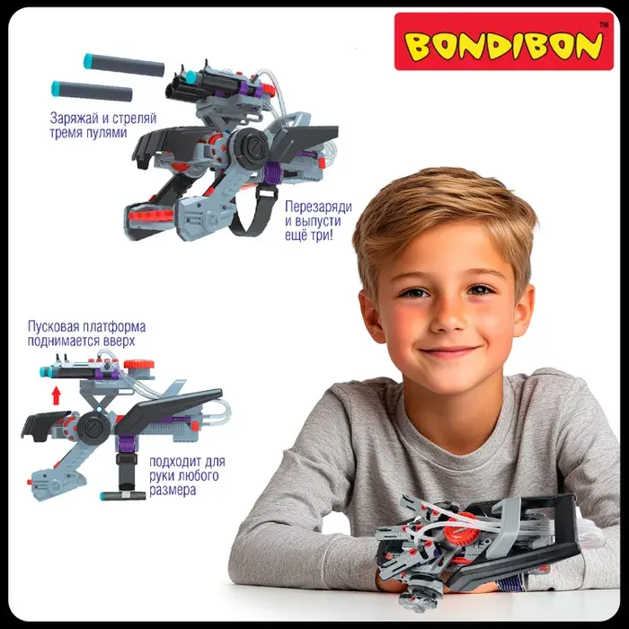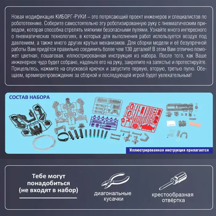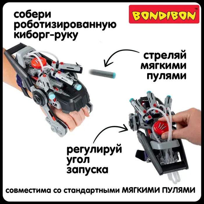 Большой игровой конструктор сочетает в себе функции механического игрушечного оружия, позволяя ребенку самостоятельно собрать и управлять настоящей киборг рукой, которая не требует батареек или электропитания. Процесс сборки интересный и понятный даже для начинающих инженеров и любителей экспериментов. Собранное кибер-оружие наденьте на руку, закрепите на запястье, прицельтесь и запускайте безопасные мягкие пули даже в помещении . Сборная роботизированная модель подходит для руки любого размера, её пусковая платформа поднимается вверх, радиус стрельбы регулируется.
