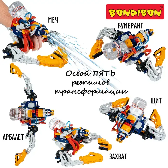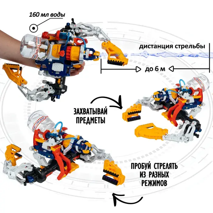 Большой игровой конструктор сочетает в себе функции механической хваталки и водяного пистолета , позволяя ребенку самостоятельно собрать и управлять настоящей гидравлической кибер рукой, которая работает на воде и не требует батареек или электропитания. Процесс сборки занимательный и понятный даже для начинающих инженеров и любителей экспериментов. Собери необычную сборную модель водного оружия и испытай ее в действии. При нажатии на курок собранный водяной бластер стреляет на расстояние до 6 м и имитирует движение цилиндра, как в настоящем револьвере. Многофункциональная робот-рука трансформируется в 5 моделей: щит, захват, меч, бумеранг, арбалет. Рукоятка может быть собрана как для правой, так и для левой руки, что делает ее универсальной. В комплекте: 180 деталей, инструкция со схемой сборки . Могут понадобиться (не входят в набор): кусачки, удлиненные плоскогубцы, отвертка, бумажные полотенца, стакан, ножницы, ватная палочка, линейка, маркер.