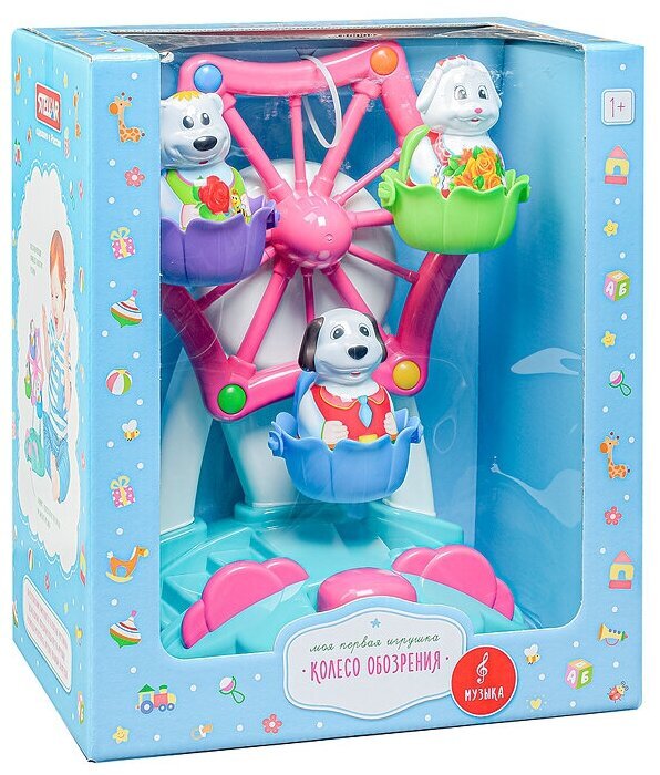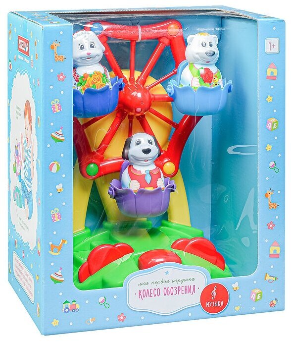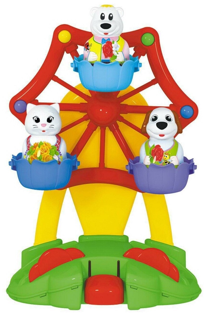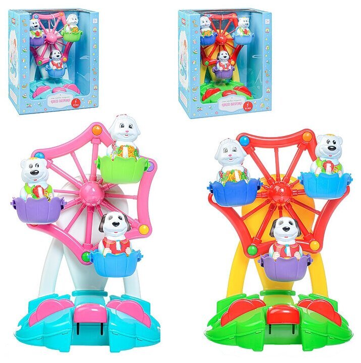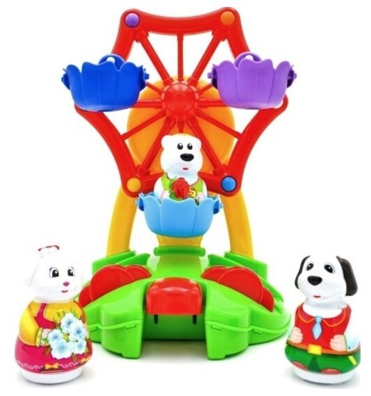 Колесо обозрения - один из самых любимых и популярных аттракционов среди детей! Парк развлечений дома? Это вполне реально! Наша новая игрушка порадует и развеселит вашего малыша, ведь она выглядит совсем как настоящее колесо обозрения. Веселый аттракцион запускается лёгким нажатием клавиши. В кабинках колеса обозрения кружатся под задорную музыку три фигурки симпатичных животных. Они легко вынимаются и могут составить крохе компанию и в другой игре. Игрушечный аттракцион идеально подходит для самостоятельной игры, он выполнен из безопасного материала и не имеет мелких деталей.