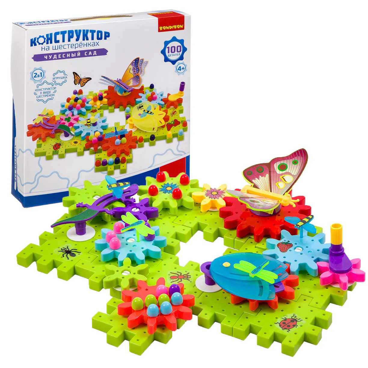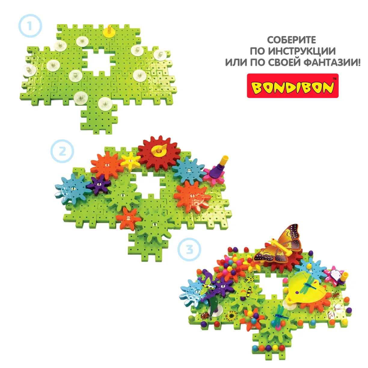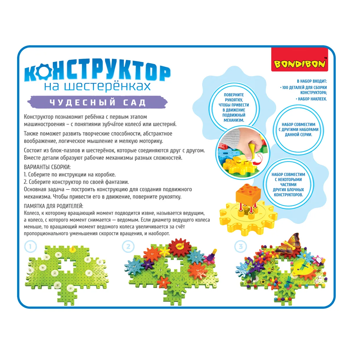 Собери полянку с бабочками и цветами и приведи ее в движение! Пластиковый конструктор на шестеренках ЧУДЕСНЫЙ САД от Bondibon состоит из 100 красочных деталей: блоков-пазлов и шестерней. Ваша задача – собрать такую конструкцию с разными по сложности подвижными механизмами, которая начнет двигаться, если повернуть рукоятку. Вы можете создать волшебный сад по инструкции или придумать что-то уникальное. Данный конструктор познакомит ребенка с первым этапом машиностроения – с понятием зубчатое колесо или шестерня. Игровой конструктор с блок пазлами ЧУДЕСНЫЙ САД от Бондибон станет прекрасным подарком, который надолго увлечет детей и поможет развить творческие способности, абстрактное воображение, логическое мышление, мелкую моторику, интерес к науке - физике и моделированию. Оригинальная игрушка изготовлена из качественных безопасных для маленьких детей материалов. Набор совместим с другими конструкторами данной серии и не требует дополнительных инструментов для сборки.