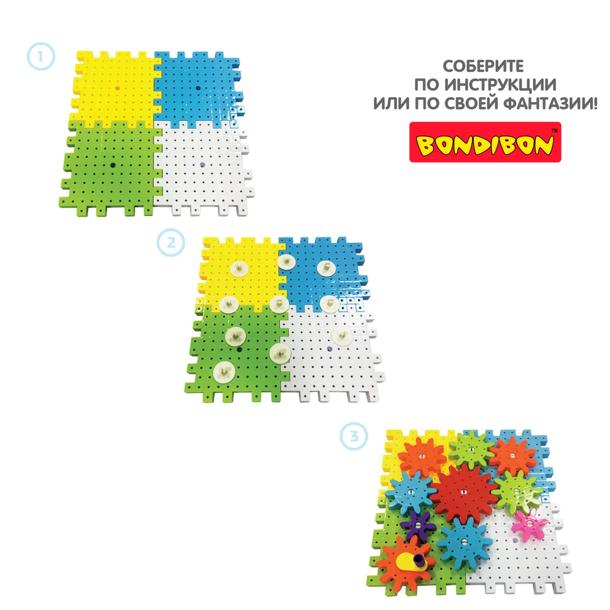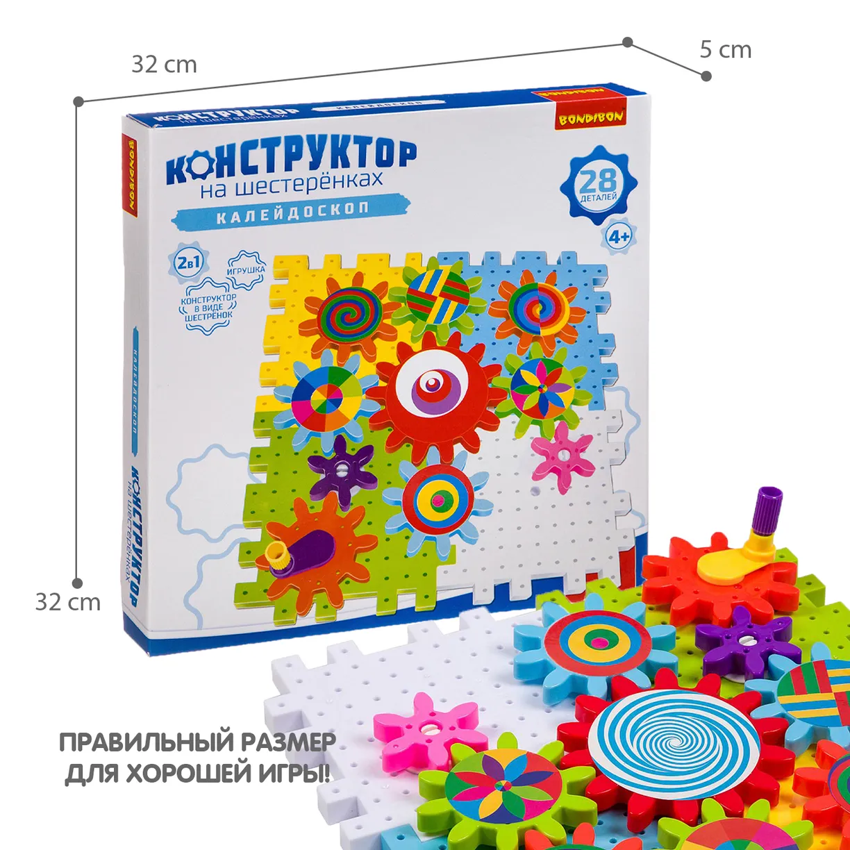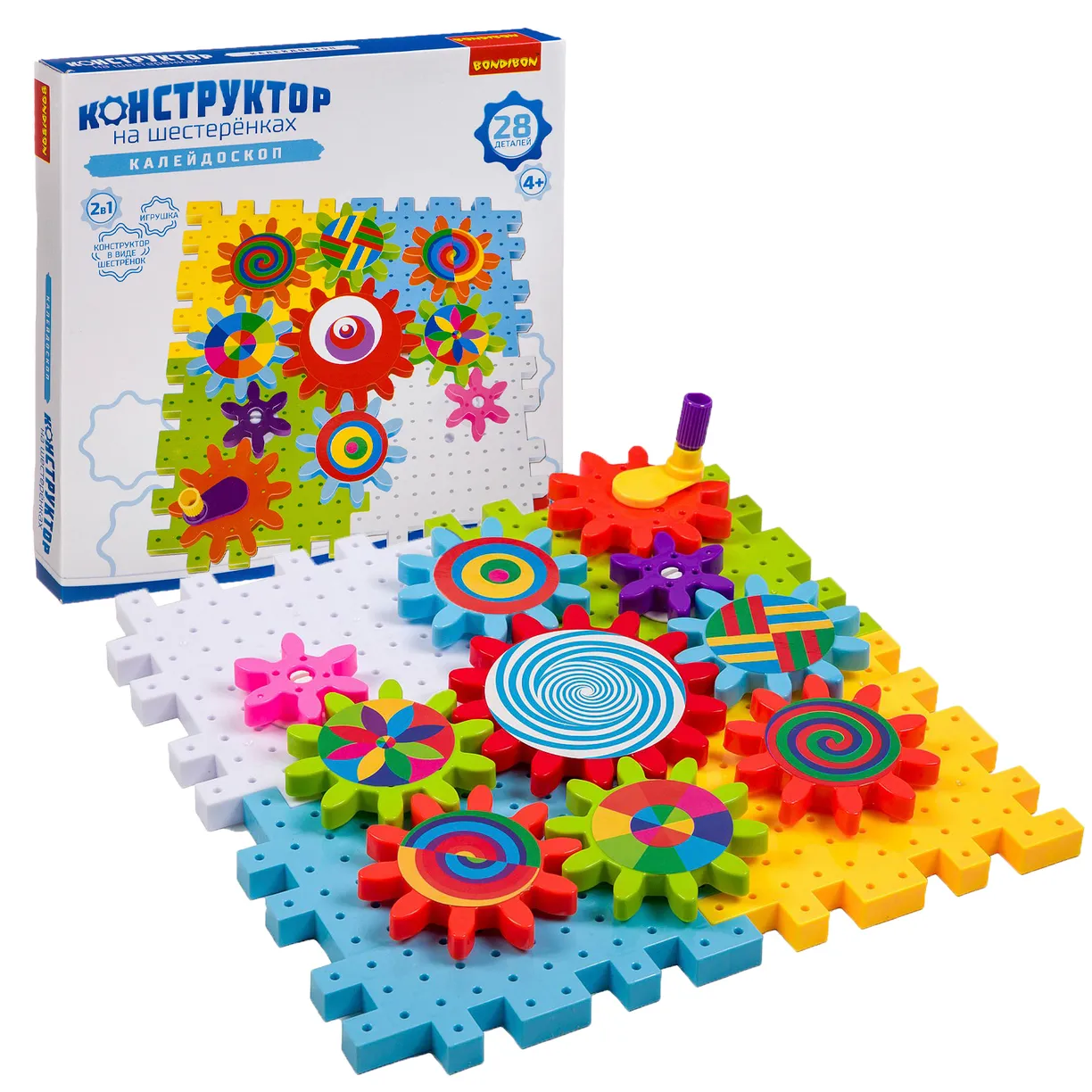 Конструктор на шестеренках КАЛЕЙДОСКОП от Bondibon состоит из 28 красочных деталей: блок - пазлов и шестерней. Ваша задача – собрать такую конструкцию с разными по сложности подвижными механизмами, которая начнет двигаться, если повернуть рукоятку. Вы можете сделать самостоятельно композицию по инструкции или придумать что-то уникальное. Пластиковый конструктор познакомит ребенка с первым этапом машиностроения – с понятием зубчатое колесо или шестерня. Игровой набор с крупными деталями КАЛЕЙДОСКОП от Бондибон станет прекрасным подарком, который надолго увлечет детей и поможет развить творческие способности, абстрактное воображение, логическое мышление, мелкую моторику, интерес к науке - физике и моделированию. Оригинальная игрушка изготовлена из качественных безопасных для детей материалов. Набор для опытов совместим с другими конструкторами данной серии и не требует дополнительных инструментов для сборки.