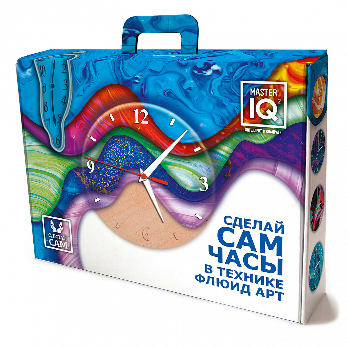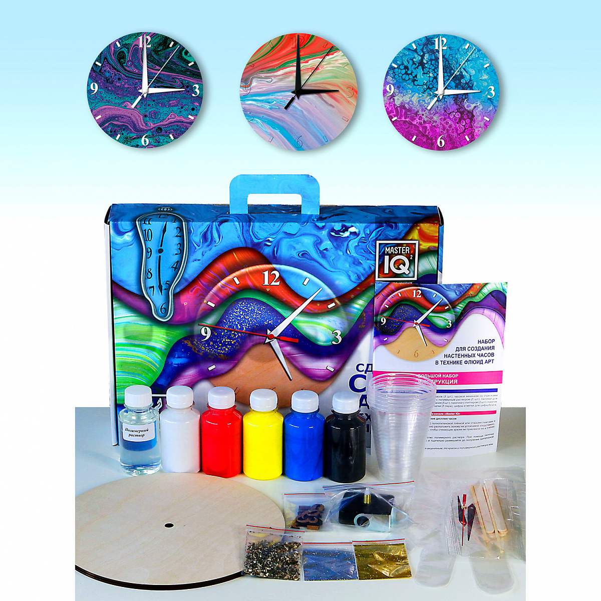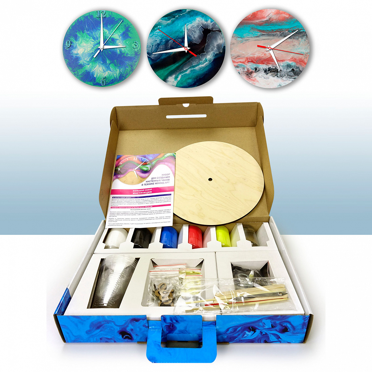 С помощью этого набора можно сделать уникальные настенные часы с неповторимым рисунком на циферблате. В набор входят подробная инструкция, основа из натурального дерева, акриловые краски (5 цветов), полимерный раствор, часовой механизм со стрелками и подвесом, глиттеры, наполнитель, перчатки и аксессуары для рисования и смешивания красок.