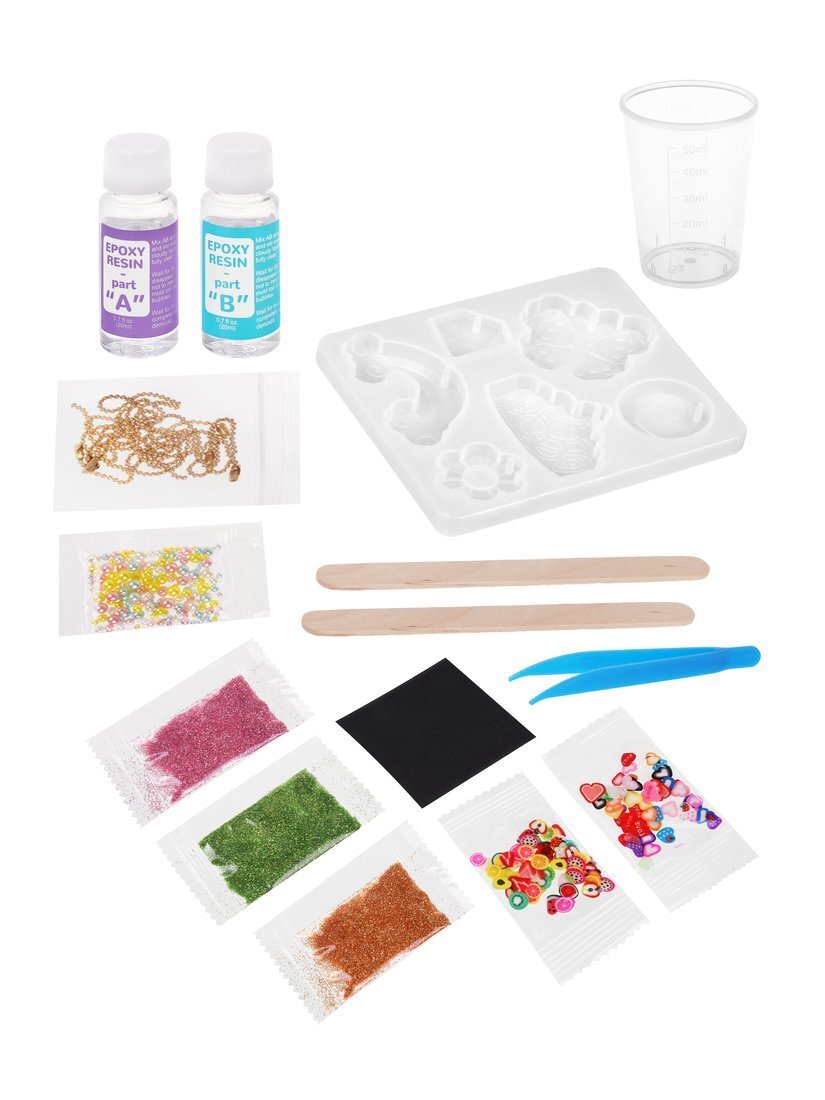 Силиконовая форма для создания украшений, стаканчик для замешивания раствора, эпоксидная смола флакон А, отвердитель для эпоксидной смолы флакон В, палочки деревянные для замешивания раствора - 2 шт., пинцет, металлическая цепочка - 6 шт., полимерные декоративные пайетки - 2 пакетика, блестящий полимерный порошок - 3 пакетика, бусины - 1 пакетик, наждачная бумага