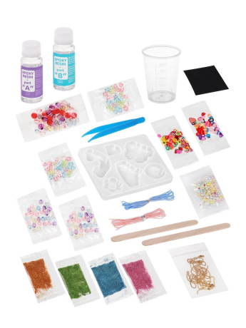 Силиконовая форма для создания украшений, стаканчик для замешивания раствора, эпоксидная смола флакон А, отвердитель для эпоксидной смолы флакон В, палочки деревянные для замешивания раствора - 2 шт., пинцет, металлическая цепочка - 4 шт., полимерные декоративные пайетки - 2 пакетика, блестящий полимерный порошок - 4 пакетика, бусины - 6 пакетиков, текстильный шнурок - 2 шт., наждачная бумага