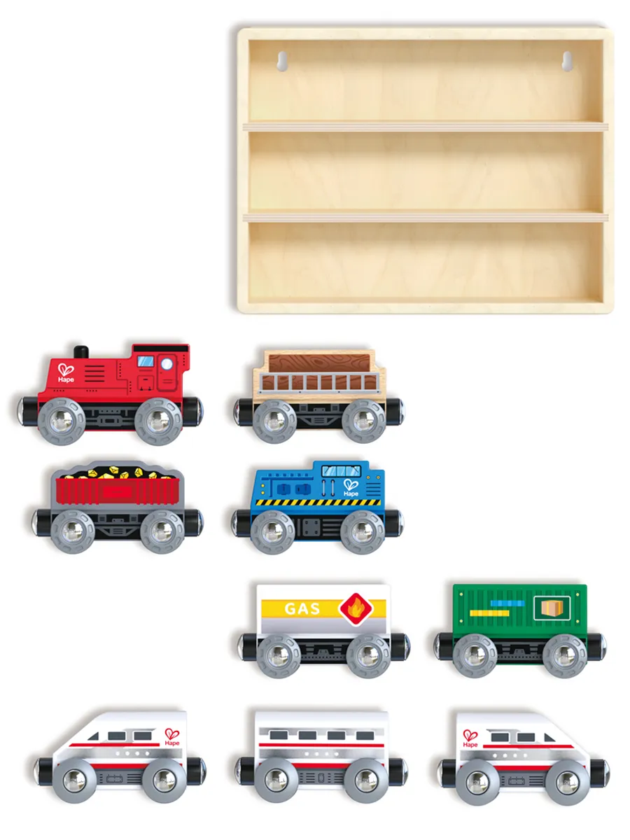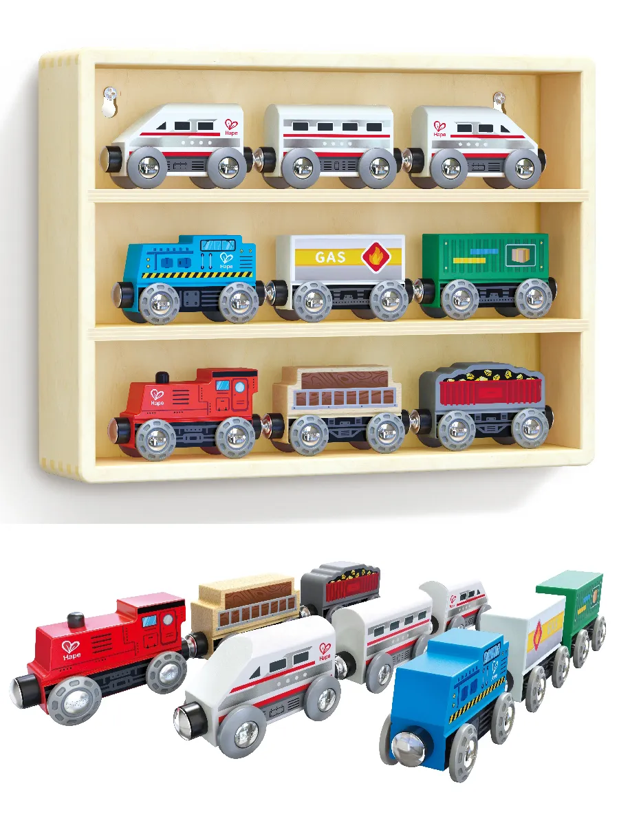 Каждый локомотив и вагон поезда содержат магнитные сцепки для легкого соединения между собой. Ящик также можно повесить на стену и использовать для демонстрации Вашей коллекции!