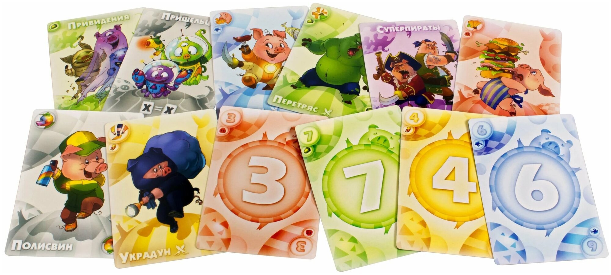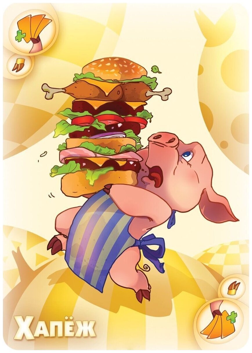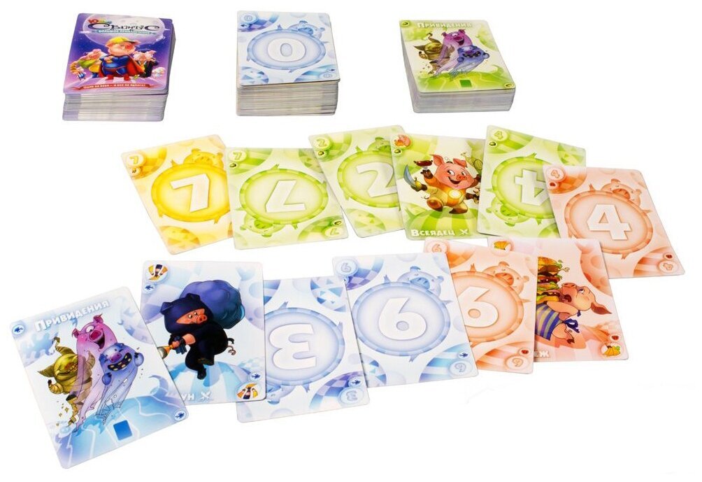 Цель игры очень проста – избавиться от всех карт с руки. Игроки в начале берут по 8 карточек и ходят по очереди скидывая карточки в одну общую стопку. Чтобы избавиться от своих 8 карт, необходимо выкладывать либо номинал на номинал (например, любую семёрку на другую семёрку), либо цвет на цвет (например, зелёный на зелёный). Конечно, есть и исключения, а также специальные карты со своими правилами. В привычные правила закралось обновление, ведь чем больше действия и фантазии в игре, тем интереснее детям! Новая карта "Указявка» позволяет игрокам придумать СВОЁ правило для игры и все игроки будут обязаны выполнять его, пока не будет выложена новая "Указявка»! А все нарушители наказываются штрафными двумя картами. Теперь рассмотрим правила "Большого приключения". Из игры убираются все специальные карты "Тихохрюнов", "Перехрюшек" и "Указявок", а карты "Злосвинов" делятся на три стопки Пиратов, Приведений и Пришельцев, кладутся картинкой вверх, так что перед вами всегда лежат три врага. Чтобы победить их, нужно выполнять различные условия. После розыгрыша карты сначала вы проверяете, сможете ли одолеть какого-нибудь "Злосвина". Вы подсчитываете карты у себя на руке и, если их семь или более, то победить вы никого не сможете – ход просто передаётся следующему игроку.