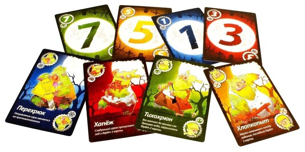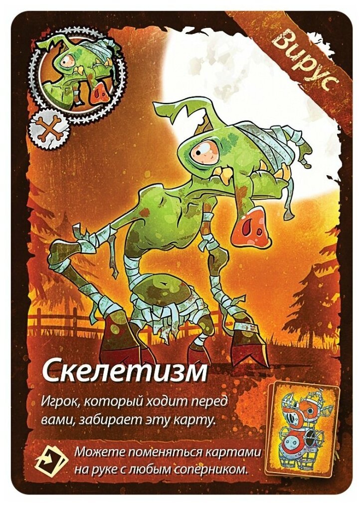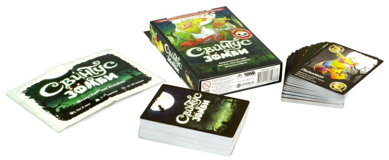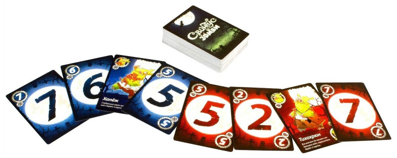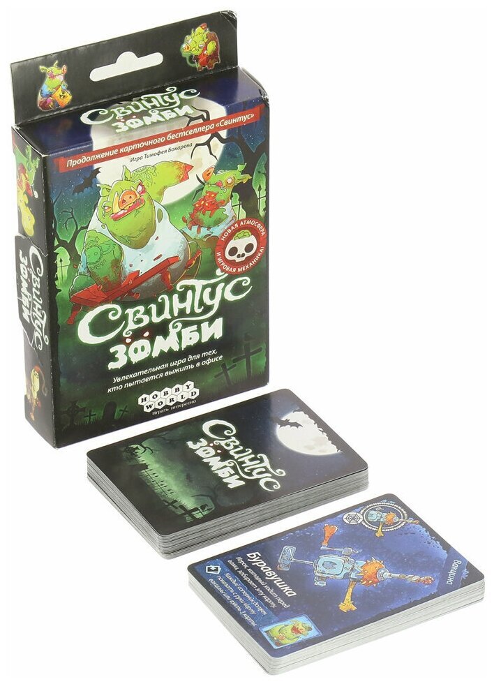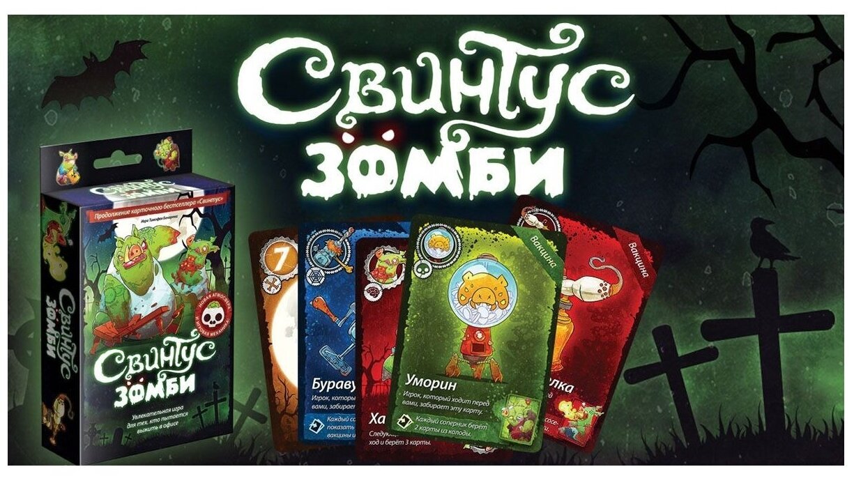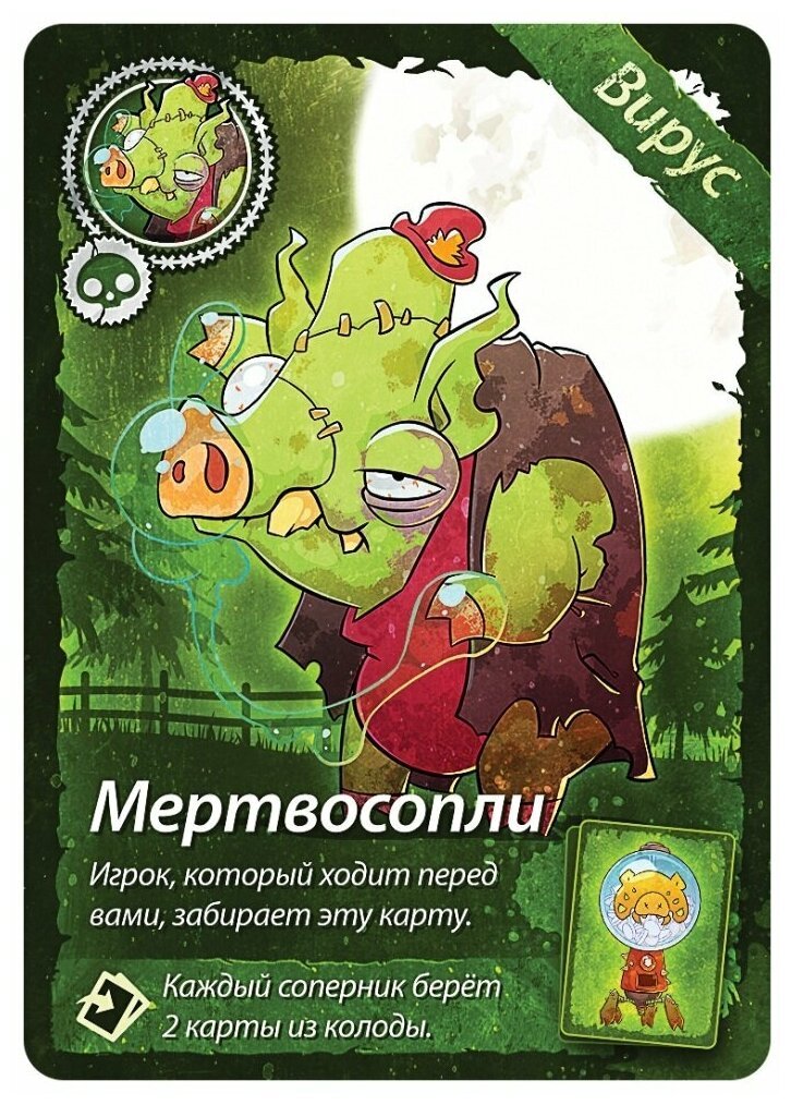 Нам по-прежнему нужно избавиться от всех своих карт посредством их розыгрыша на верхнюю карту стопки, это называется. Помимо карт с номиналом, есть и специальные карты, которые превращают эту игру в концентрированное веселье, например, запрещают на целый раунд издавать любые звуки или пропустить ход и еще многие другие. Как и раньше, побеждает тот игрок, который первым смог избавиться от всех своих карт. Помимо нового сеттинга и нового дизайна карт, эта версия порадует Вас совершенно новыми специальными картами вирусов и вакцин. Эти карты норовят остаться у Вас на руках, а, чтобы их сбросить, нужно потрудиться. Три новых правила дополняют этот новый набор карт. В остальном же перед вами старый добрый "Свинтус", играющий новыми мрачными цветами