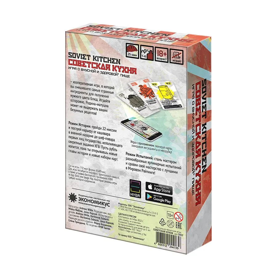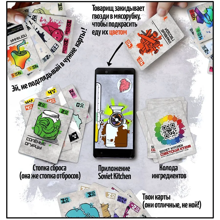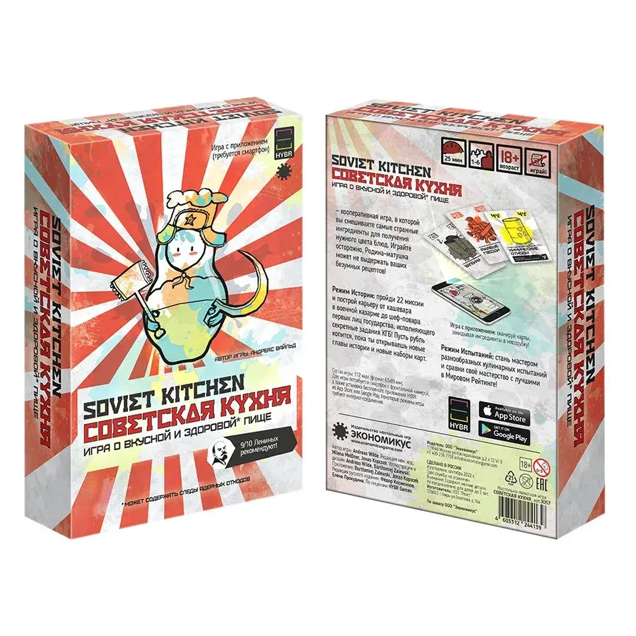 Что вас ждёт? Мобильное приложение: взаимодействуйте с ингредиентами, используя смартфон, и наблюдайте за результатами ваших кулинарных экспериментов. Разнообразие режимов: -кампания: начните с роли кашевара и дойдите до повара КГБ. -онлайн-режим: играйте с друзьями, где бы они ни находились. Соревнуйтесь с другими игроками и стремитесь к вершине мирового рейтинга. Погрузитесь в атмосферу советских времён и почувствуйте себя настоящим шефом экстремальной кухни. "Советская кухня" станет отличным подарком другу или подруге на любой праздник. Она принесет массу эмоций и гарантирует незабываемое времяпрепровождение. Идеально подходит для вечеров в кругу близких людей или шумных посиделок в компании. Каждая карта игры погружает участников в уникальную атмосферу прошлого, напоминая о традициях, вкусах и духе советских времен. Игра не требует длительной подготовки — просто откройте коробку, раздайте карты участникам и начните веселиться!