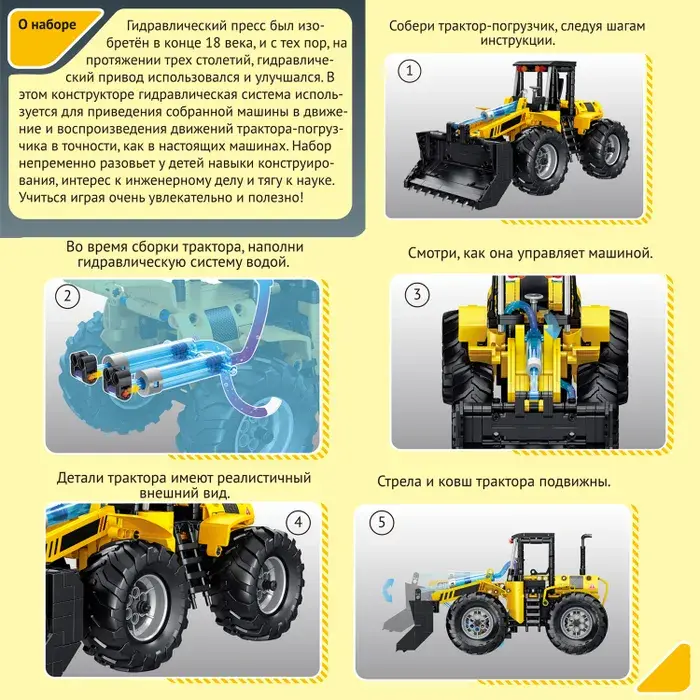 Подарите ребенку увлекательное путешествие в мир технических чудес с набором робототехники с Буки Гидравлическая машина трактор погрузчик от Bondibon! Этот набор превращает обычный день в праздник инженерных открытий. Что может быть лучше для развития моторики и творческих навыков? Игрушка идеально подходит для мальчиков, которые интересуются техникой и мечтают о необычных экспериментах. Конструктор позволяет построить большую гидравлическую машину, способную выполнять задачи настоящего погрузчика. Но это не просто игровой предмет — это целый мир строительных экспериментов, который помогает детям понять основы робототехники и управления. Занятия с трактором формируют полезные навыки, развивают логику и укрепляют уверенность в своих силах. Ваш ребенок сможет собрать сборную модель самостоятельно или вместе с друзьями, что сделает процесс еще более захватывающим. Процесс сборки трансформера – это не просто времяпрепровождение, а настоящее образовательное приключение. Детский трактор предлагает невероятно интересные опыты, демонстрирующие работу гидравлических систем и позволяющие понять принцип их действия.