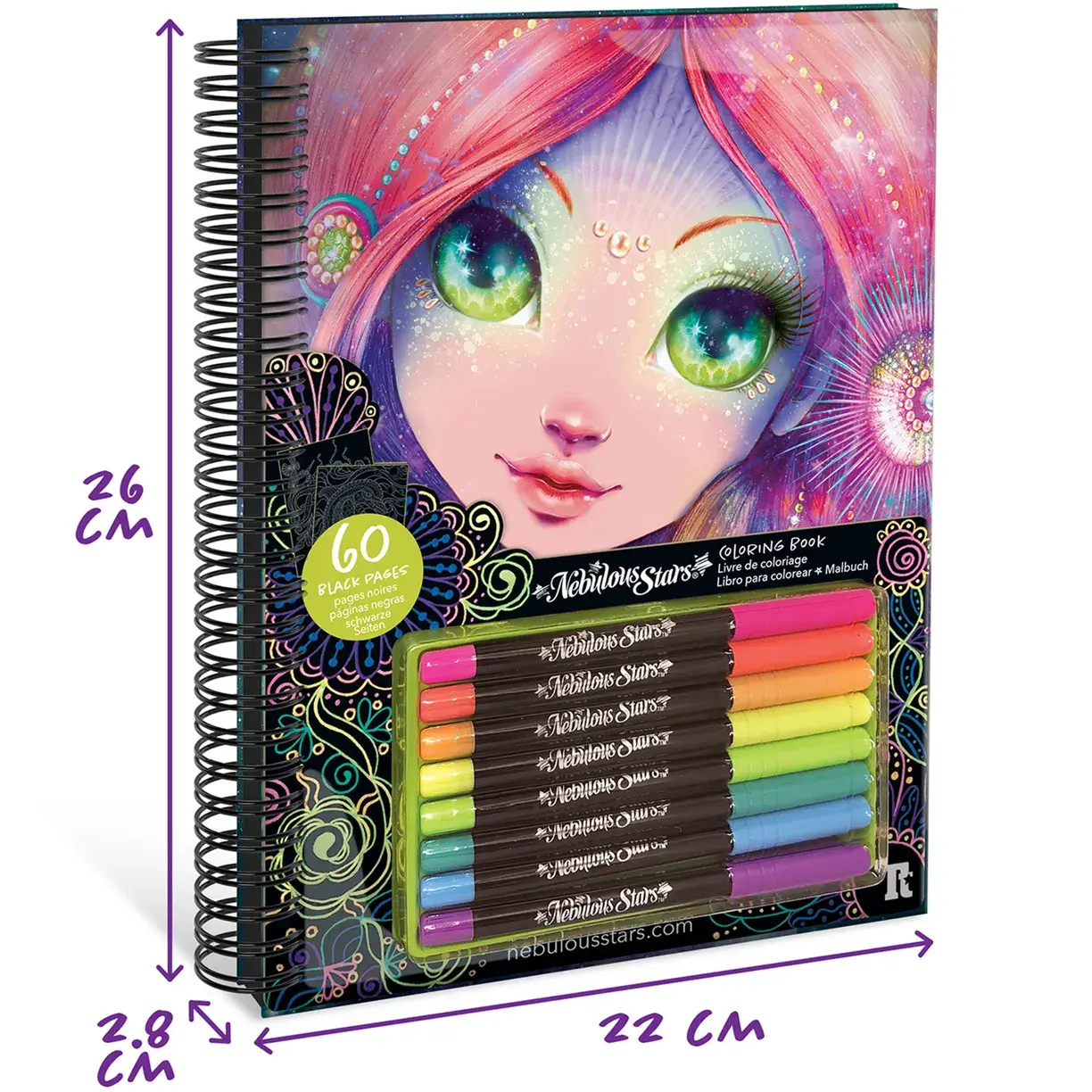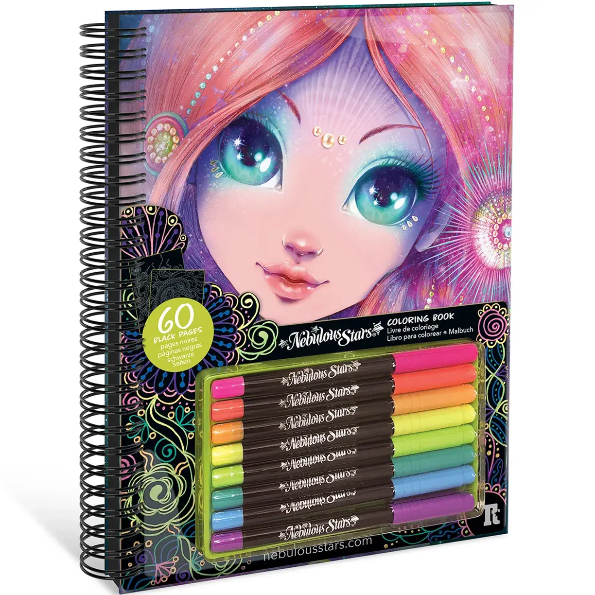 Раскраска для девочек - скетчбук на пружине с эскизами на страницах черного цвета. Создание яркой коллекции рисунков с помощью неоновых гелевых фломастеров.