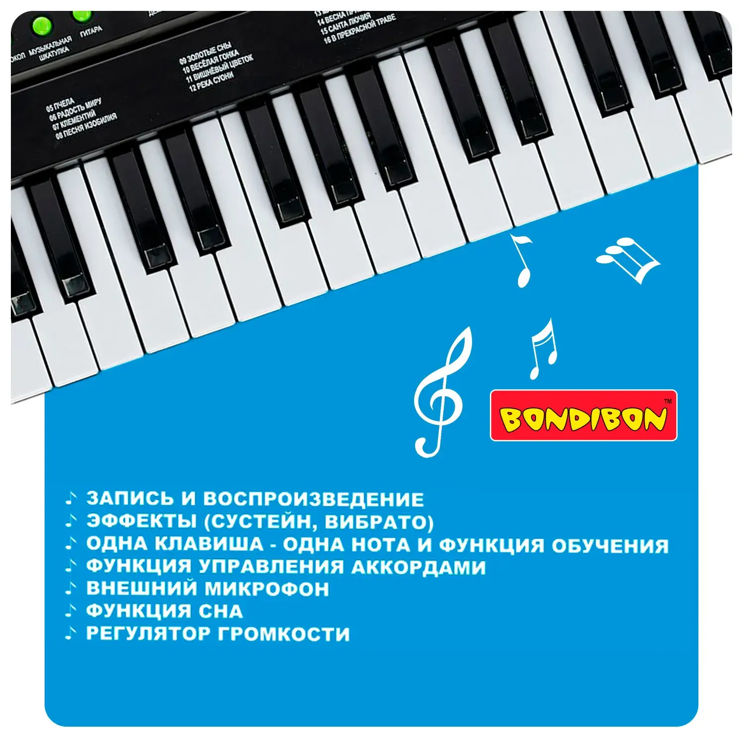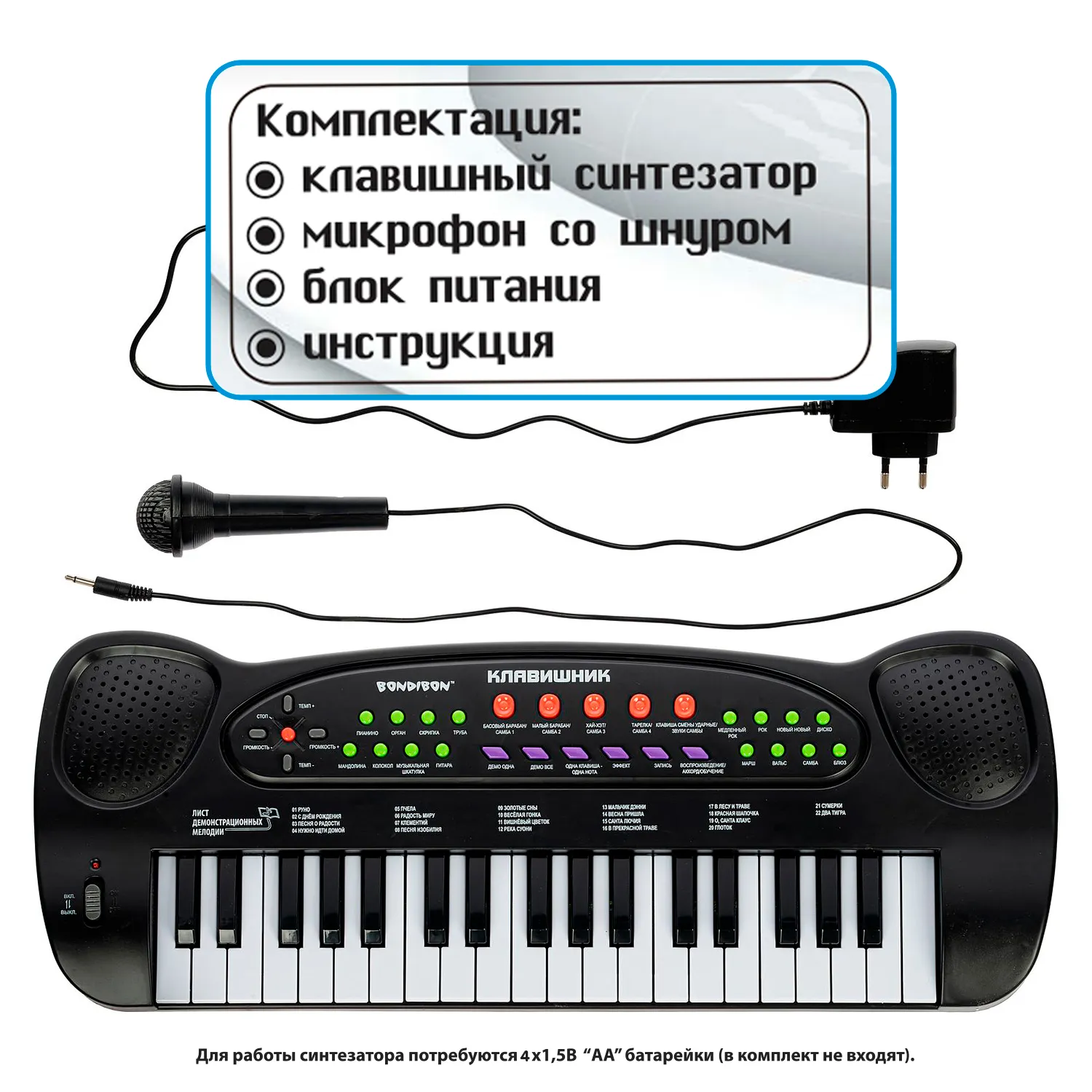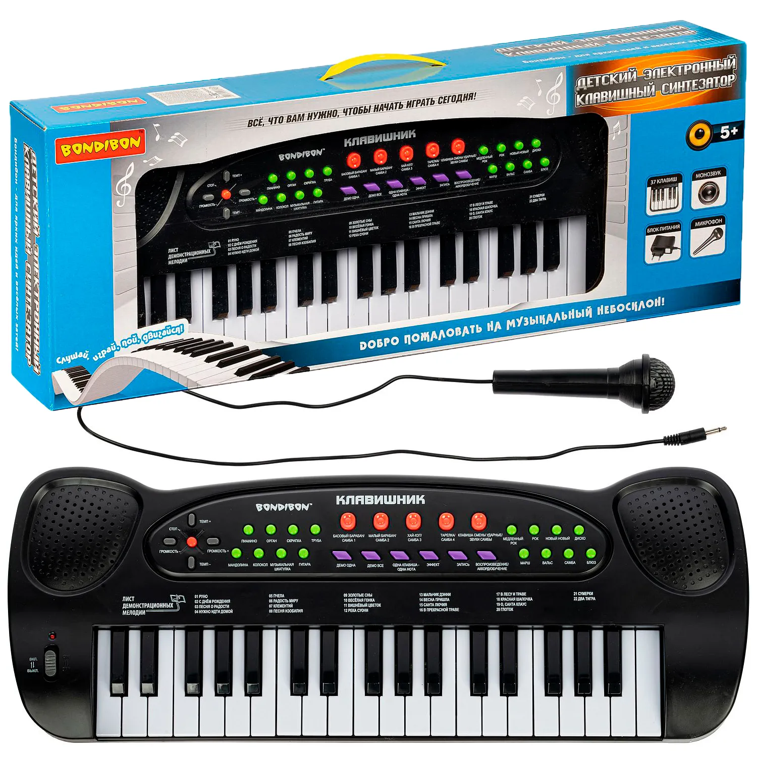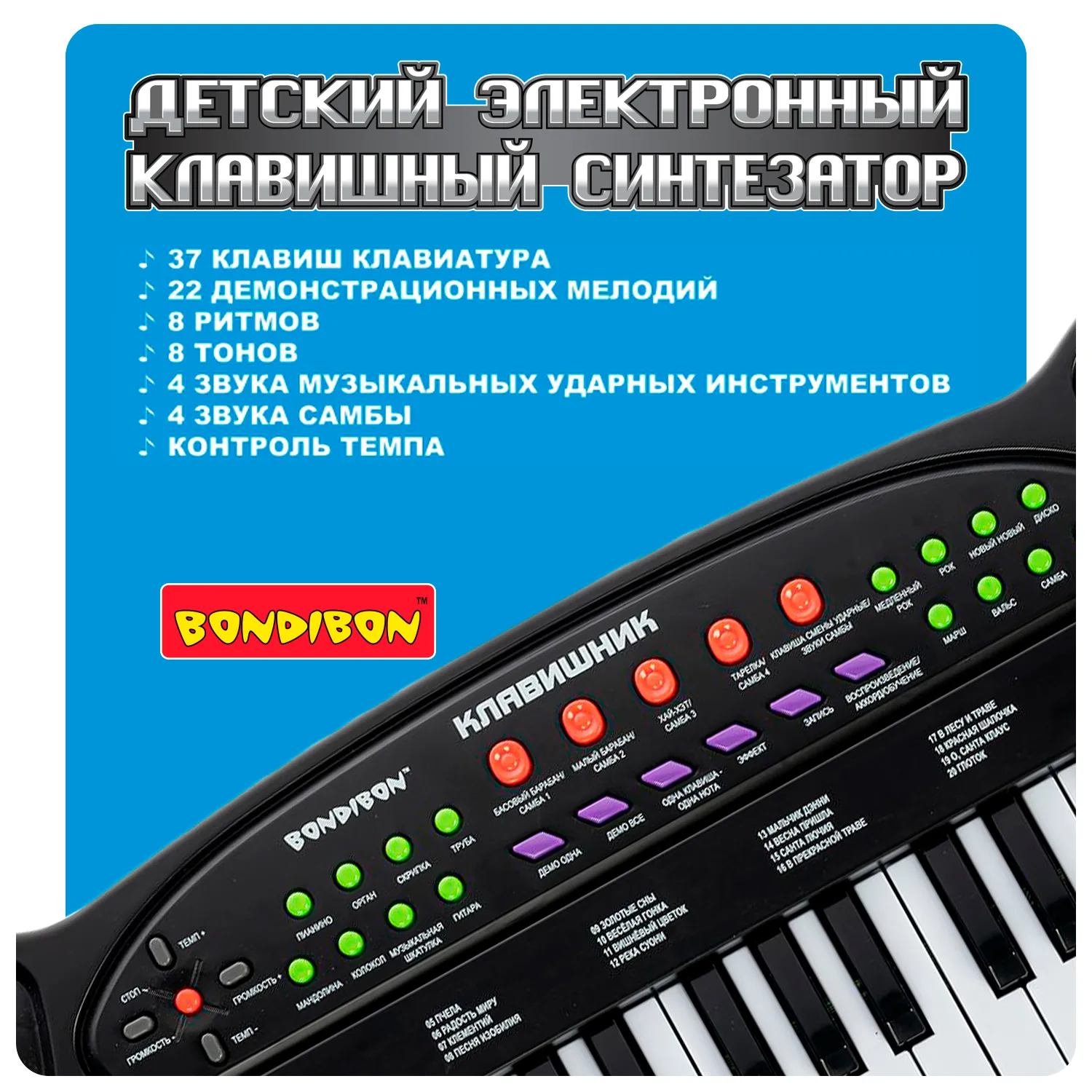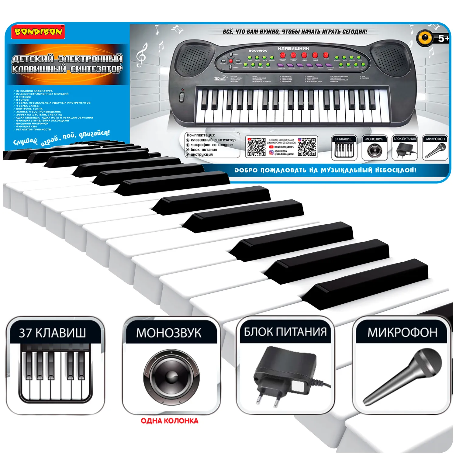 Музыкальный гаджет, который позволит ребенку развить творческие способности! Электронный синтезатор детский КЛАВИШНИК с микрофоном и блоком питания от Bondibon – это игрушка, которая обладает большим функционалом. Клавиатура состоит из 37 клавиш. Одна колонка обеспечивает качественный монозвук. В комплект также входит микрофон. Синтезатор оснащен функцией записи и воспроизведения мелодий. Громкость регулируется. Вы сможете научиться играть на синтезаторе и создавать собственные композиции, используя 22 демонстрационные мелодии, 8 тонов, 8 ритмов, 4 звука ударных музыкальных инструментов, 4 звука самбы, а также контроль темпа. Синтезатор КЛАВИШНИК 37 электронных клавиш от Бондибон поможет развить слуховое восприятие, чувство ритма, мелкую моторику и воображение. Компактное детское пианино с микрофоном удобно использовать в качестве домашнего музыкального инструмента. Питание от сети 220 В или 4 батареек АА (в набор не входят). Есть функция экономии батареи (сна).