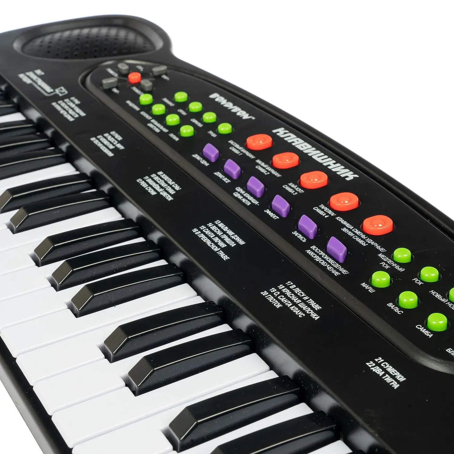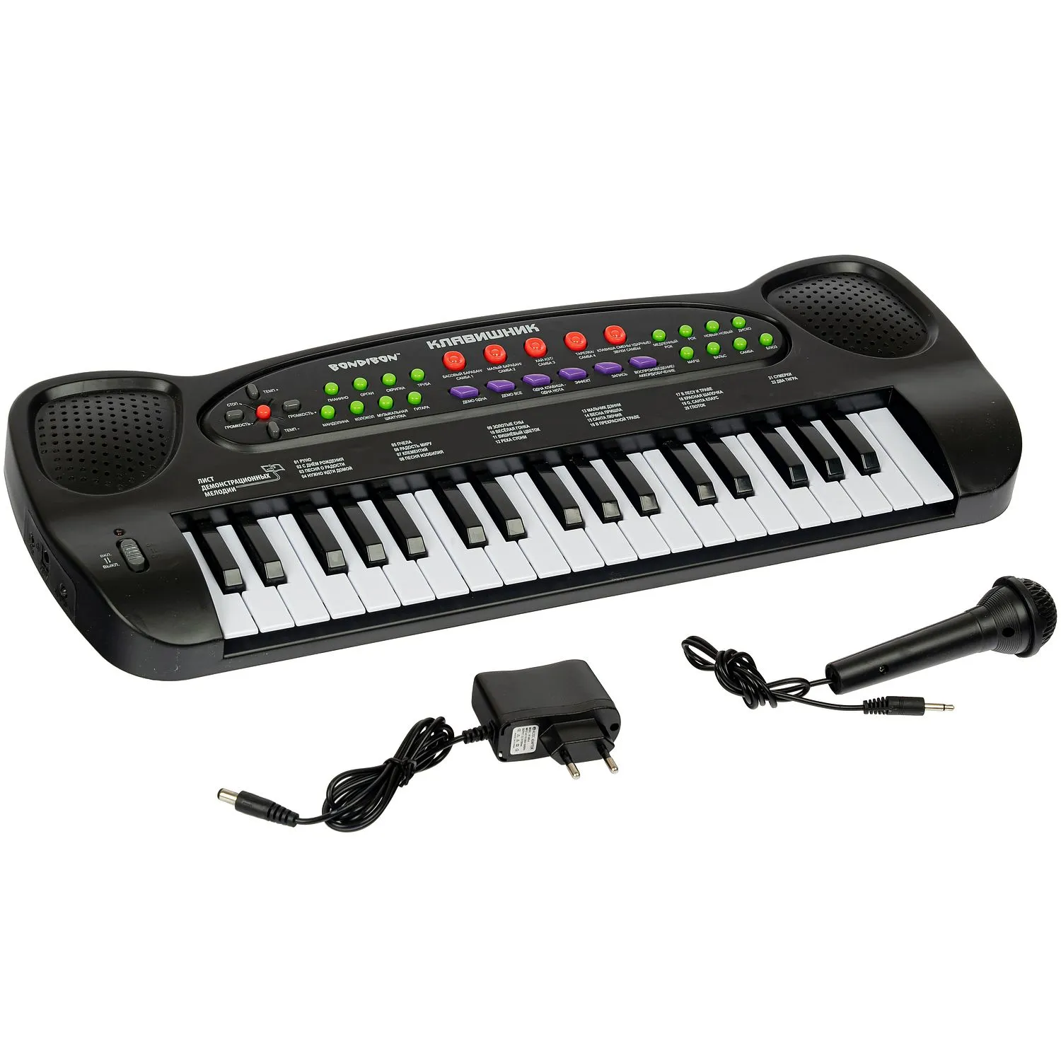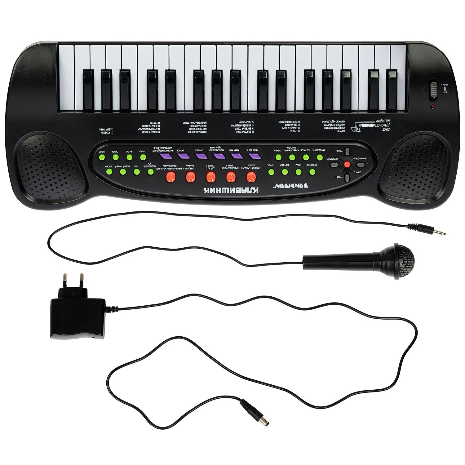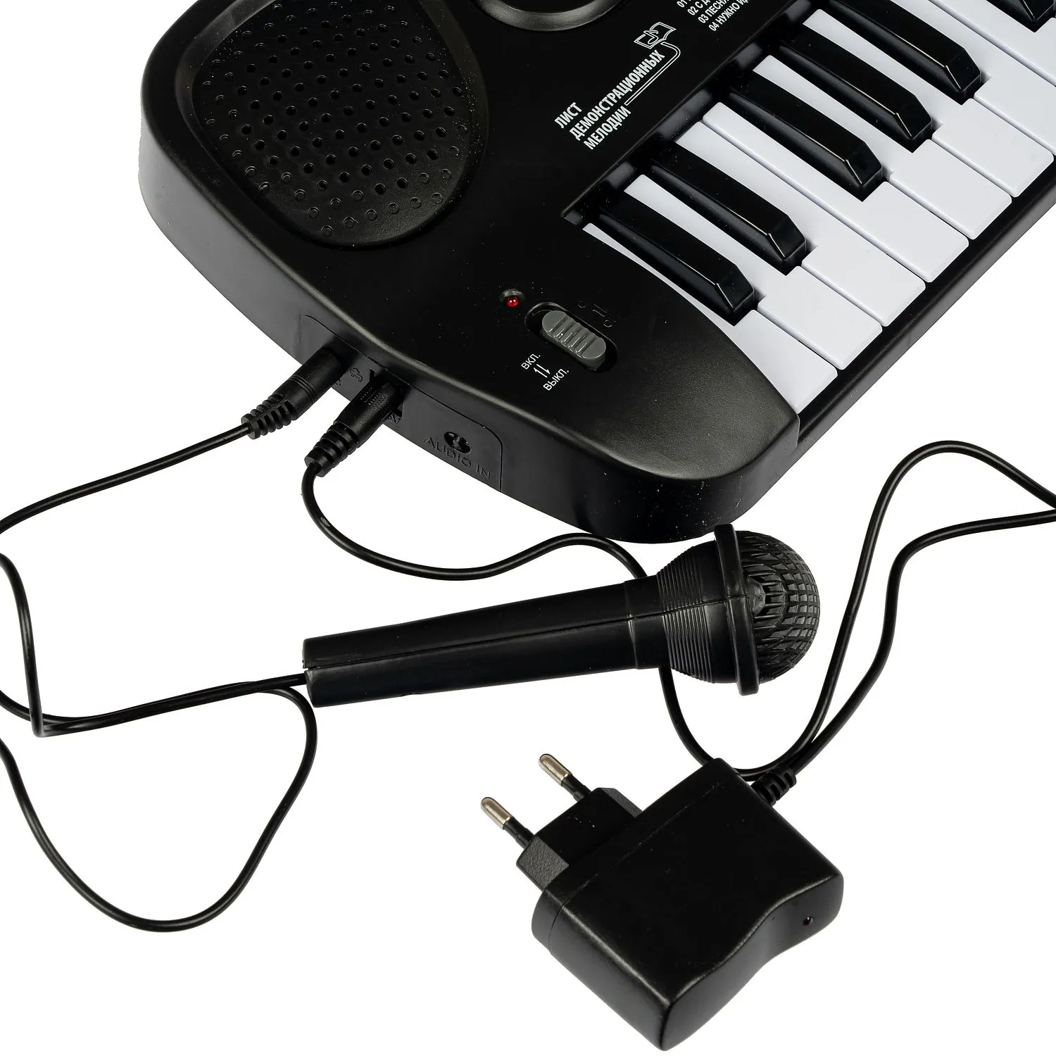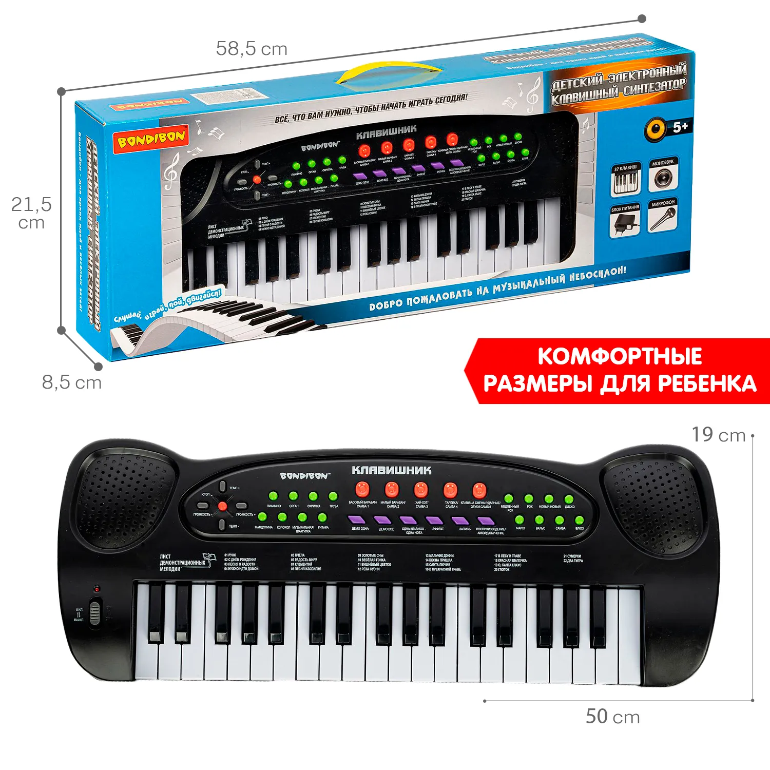 Музыкальный гаджет, который позволит ребенку развить творческие способности! Электронный синтезатор детский КЛАВИШНИК с микрофоном и блоком питания от Bondibon – это игрушка, которая обладает большим функционалом. Клавиатура состоит из 37 клавиш. Одна колонка обеспечивает качественный монозвук. В комплект также входит микрофон. Синтезатор оснащен функцией записи и воспроизведения мелодий. Громкость регулируется. Вы сможете научиться играть на синтезаторе и создавать собственные композиции, используя 22 демонстрационные мелодии, 8 тонов, 8 ритмов, 4 звука ударных музыкальных инструментов, 4 звука самбы, а также контроль темпа. Синтезатор КЛАВИШНИК 37 электронных клавиш от Бондибон поможет развить слуховое восприятие, чувство ритма, мелкую моторику и воображение. Компактное детское пианино с микрофоном удобно использовать в качестве домашнего музыкального инструмента. Питание от сети 220 В или 4 батареек АА (в набор не входят). Есть функция экономии батареи (сна).