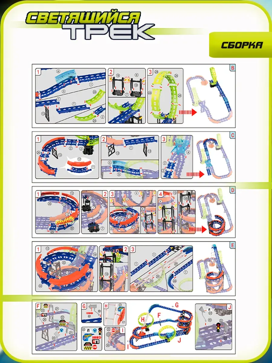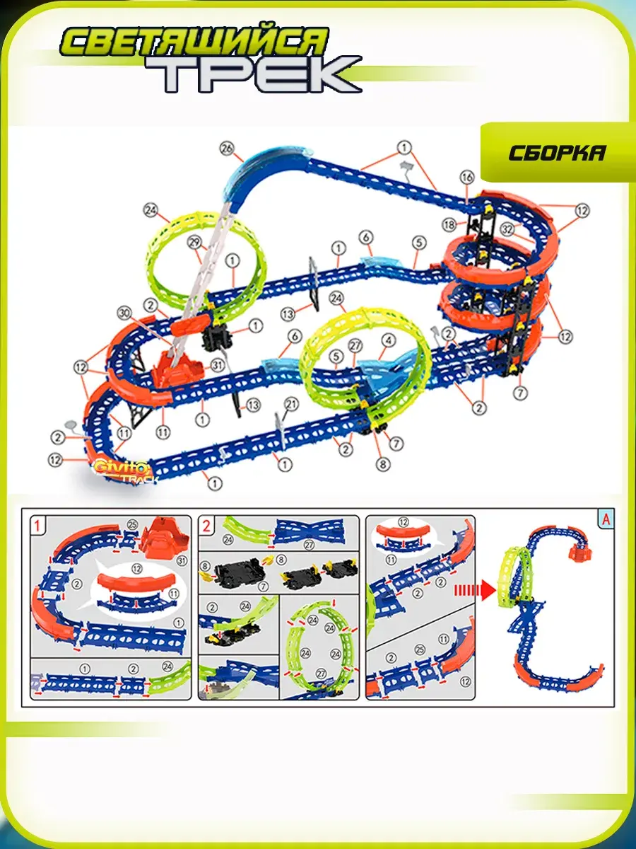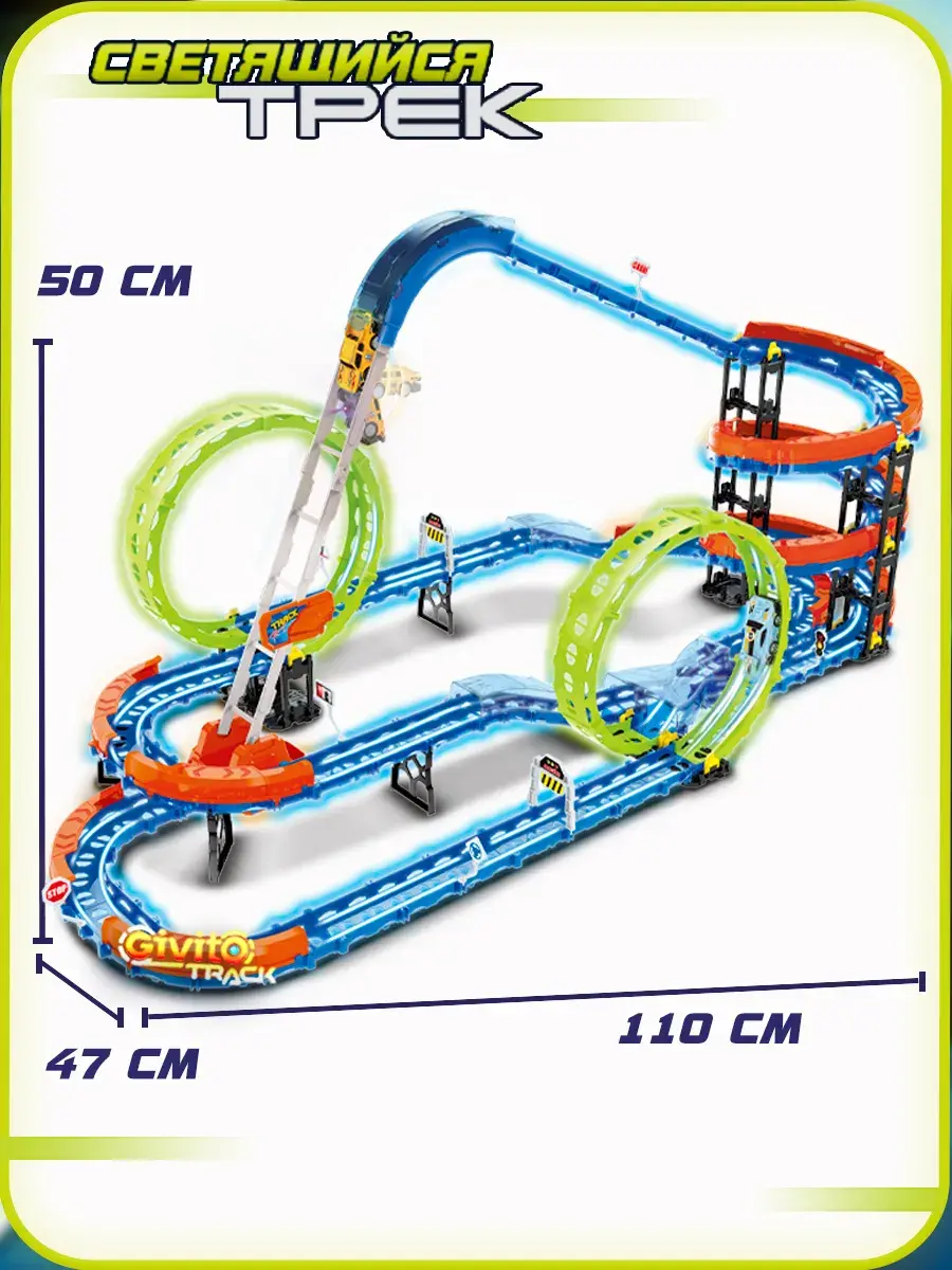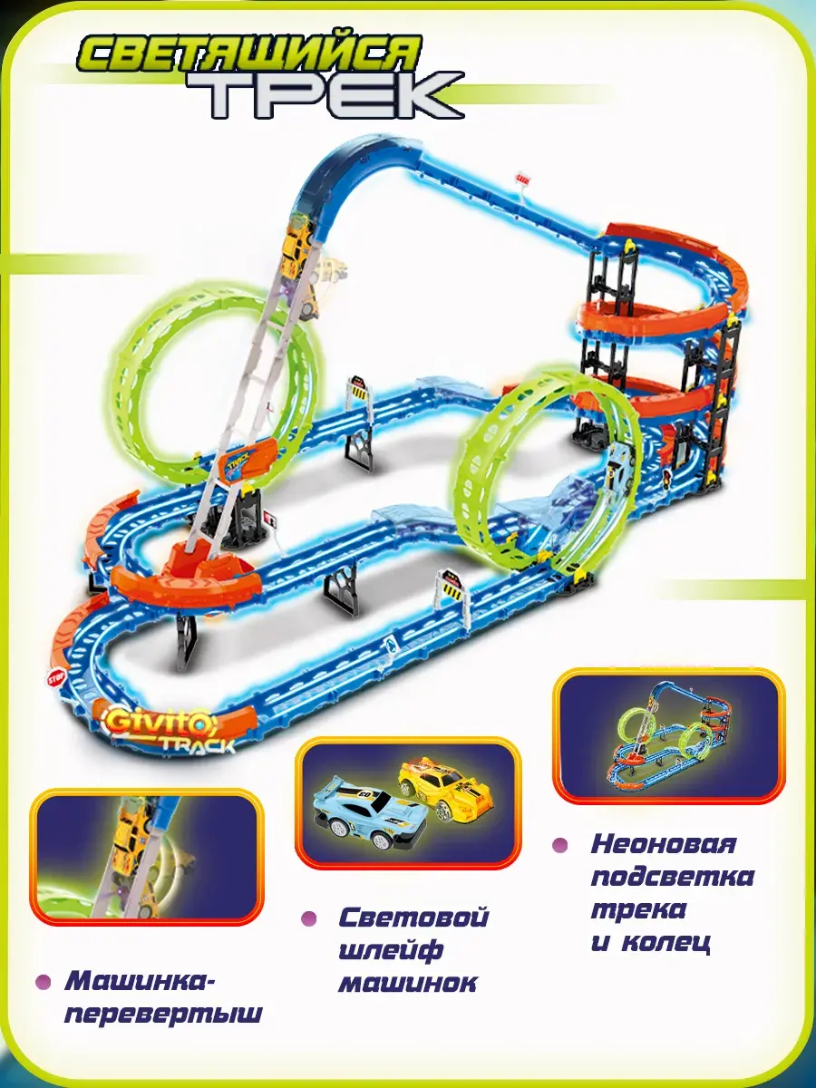 - Многоуровневый гоночный автотрек с круговым подъёмом, крутым спуском и двумя неоновыми петлями 360°: уникальная конструкция трассы позволяет автомобилю выполнять крутые виражи и перевороты.