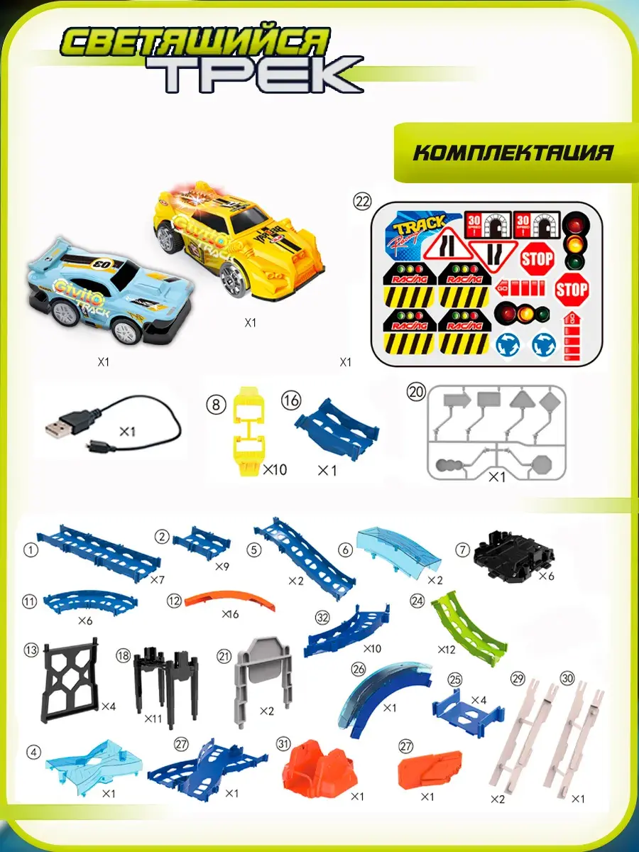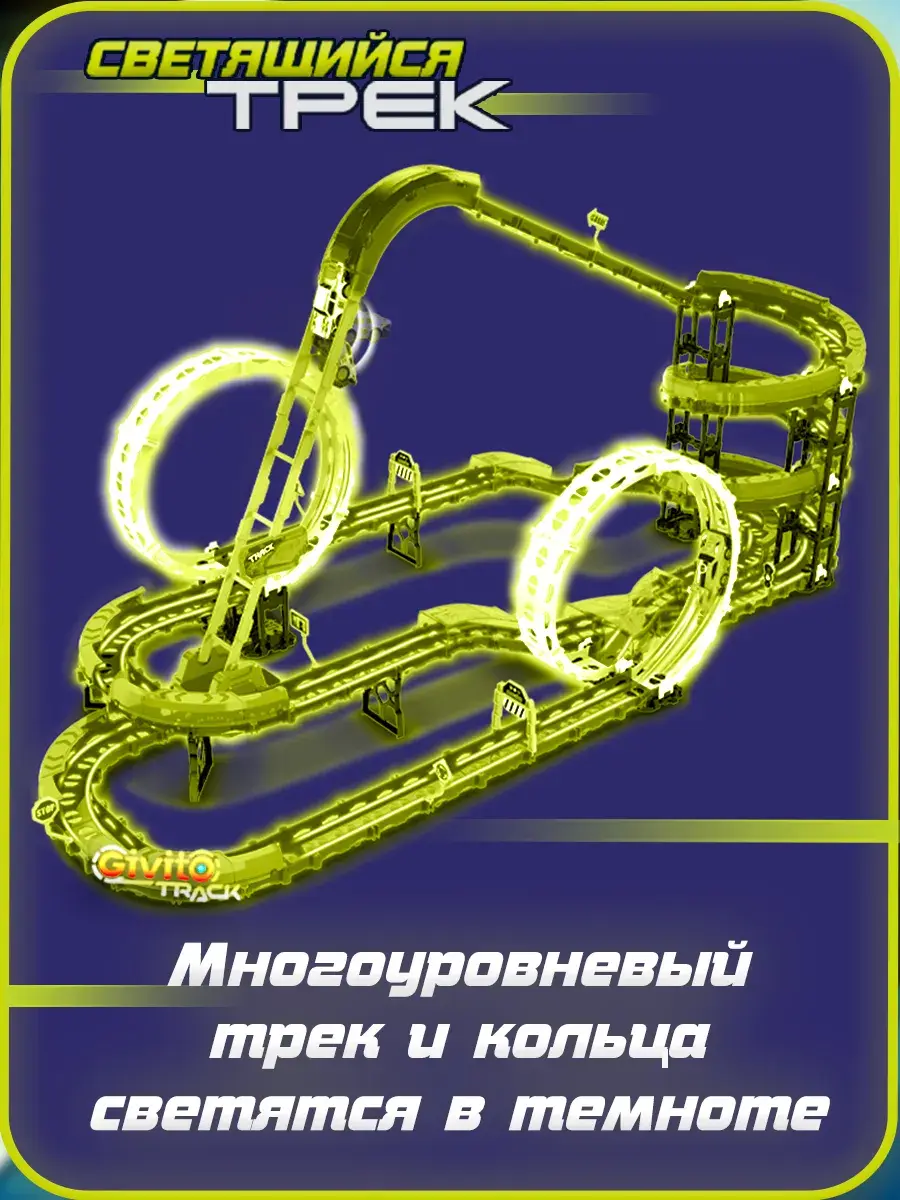 - Светящийся автотрек: петли светятся в темноте, а сама машинка оставляет за собой световой шлейф на дороге, что делает гонки еще более эффектными и зрелищными.