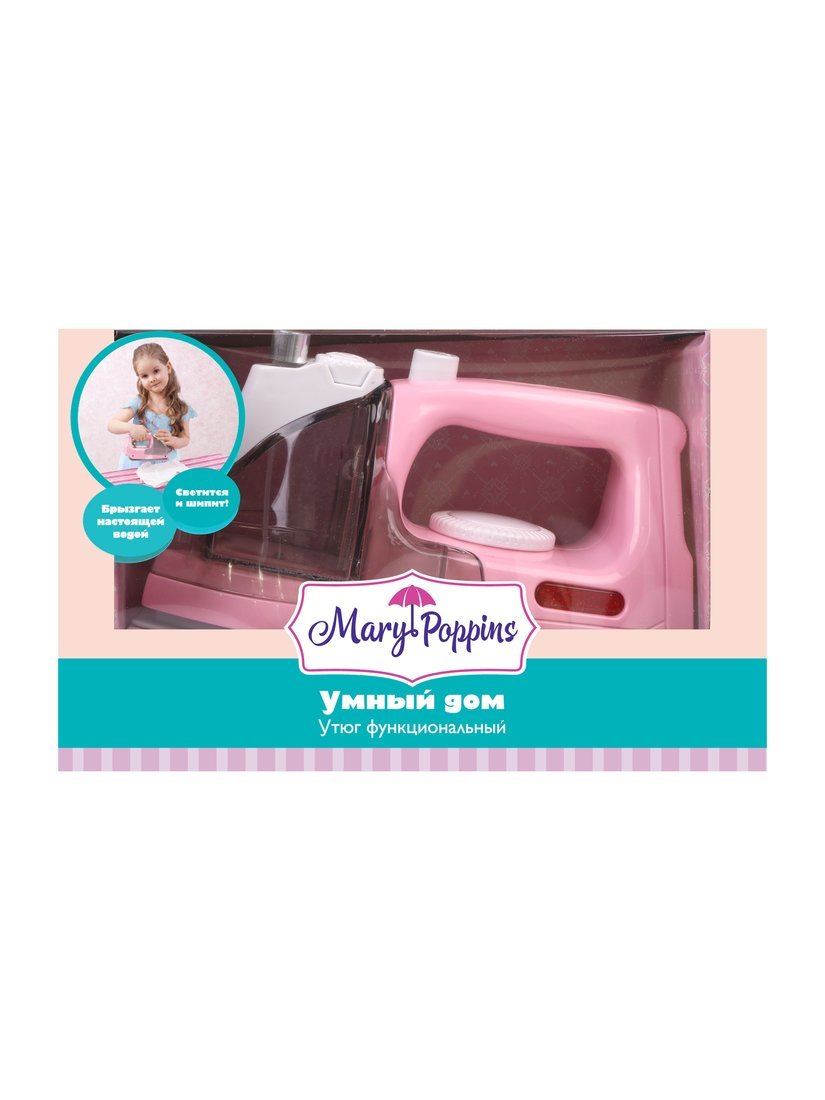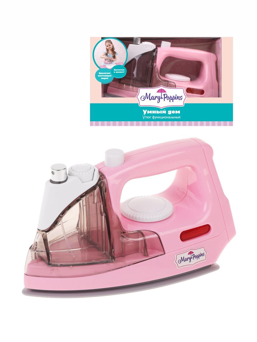 Функциональный утюг из серии «Умный дом» от ТМ Mary Poppins познакомит маленькую хозяюшку с первыми предметами быта! В игрушке предусмотрены светозвуковые эффекты: подсветка и реалистичный шипящий звук, имитирующий подачу пара. Колёсико выбора режимов можно вращать. Отсек, расположенный в передней части игрушки, можно наполнить настоящей водой и брызгать ей из пульверизатора на бельё.