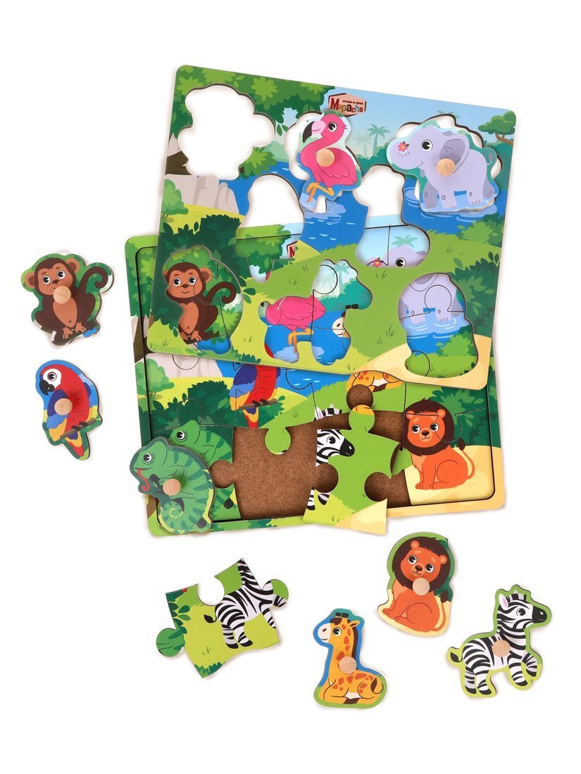 В игровом мире TM Mapacha джунгли совсем не опасные, а очень даже приветливые и веселые! Яркие вкладыши 2 в 1 познакомят малыша с симпатичными обитателями дикой природы, помогут ему развить мелкую моторику, воображение и логику, а также запомнить цвета в увлекательной игровой форме.