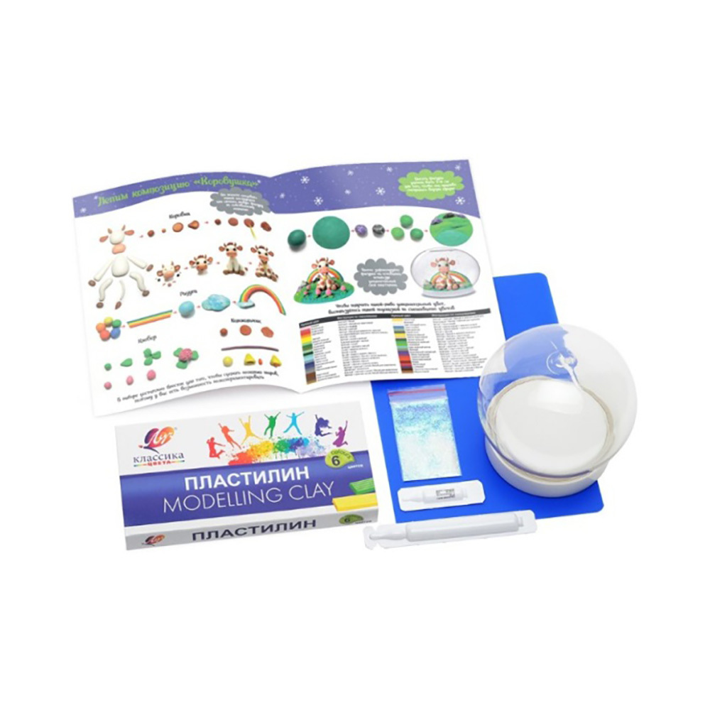подробная инструкция, сферическая основа для шара, цветной пластилин, доска для лепки, подставка для композиции, специальные жидкости, блестки для создания снежного эффекта